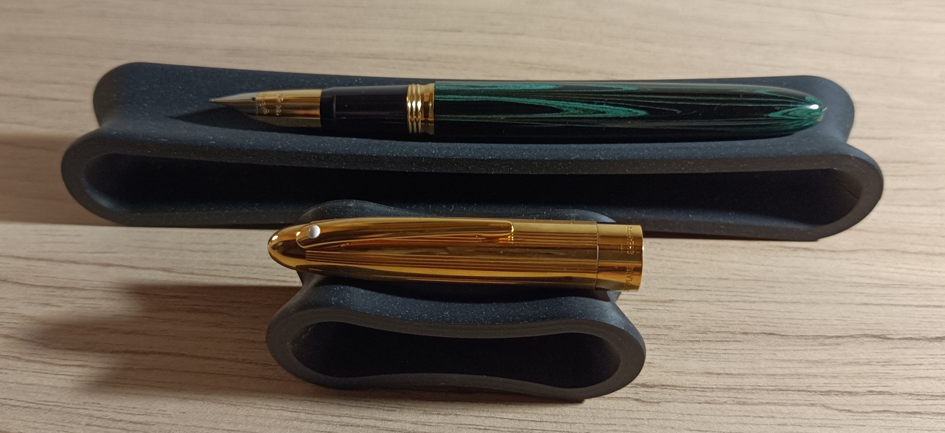Iniziamo questo viaggio con una penna relativamente moderna, la Sheaffer Crest MK II; si tratta della riedizione moderna, con caricamento a cartuccia-converter, della storica Snorkel Pen. Furono prodotte in diverse varianti di colore e materiali, tra cui eleganti laccature, resine e metalli. Questo esemplare era del tipo con cappuccio in metallo placcato in oro tramite galvanostegia e corpo in resina. Eh già, dico “era” perché questa penna ha una storia molto interessante alle spalle, raccontatami da colui che me l’ha venduta: la penna fu acquistata nuova, ma per via di instabilità di quel materiale plastico il corpo si deformò restringendosi (mi pare che un problema simile successe con i primi esemplari in “auroloide” di Aurora) e lui, eccelso artigiano, decise di ricostruire il corpo della penna usando un’ebanite nera striata di verde. Ebbi così la fortuna e quasi l’onore di avere tra le mani una penna unica e di un bellissimo materiale. Ma andiamo con ordine.