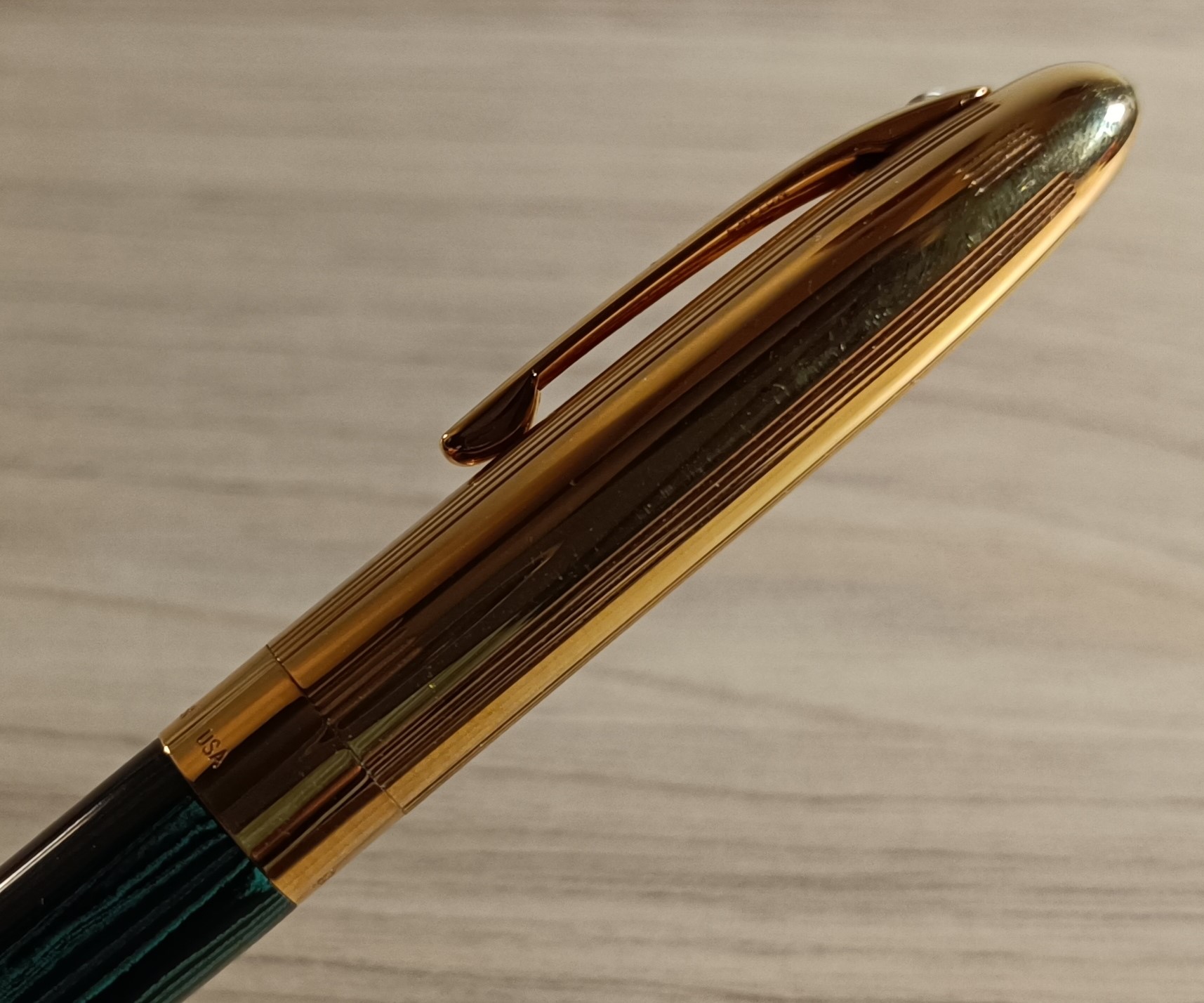 Per quanto riguarda la descrizione esteriore della penna, da chiusa essa si presenta con una forma a sigaro senza interruzioni della linea esterna, come dicevo il cappuccio è in metallo placcato oro con la tecnica della galvanostegia, presenta una decorazione a righe raggruppate a gruppi di quattro che si interrompe sulla sommità, che è lasciata liscia, e alla fine, creando una sorta di banda sul limite inferiore della quale sono incise le scritte: “GOLD ELECTROPLATE / SHEAFFER / USA”. Da notare che uno dei fasci di righe, è troncato e lascia uno spazio vuoto nel decoro, molto probabilmente allo scopo di accogliere un’incisione con un nome, una data ecc. La clip è molto semplice, a molla, e presenta il pallino bianco prima simbolo della garanzia a vita e poi divenuto il logo della Sheaffer incastonato sulla sommità, leggermente sporgente. Il corpo è in una bellissima ebanite a fondo nero con striature verdi che ricordano molto le venature del legno, perfettamente lucidata e levigata. Le dimensioni sono piuttosto contenute: circa 134 mm da chiusa, circa 116 mm da aperta. Anche il diametro è piuttosto contenuto.
