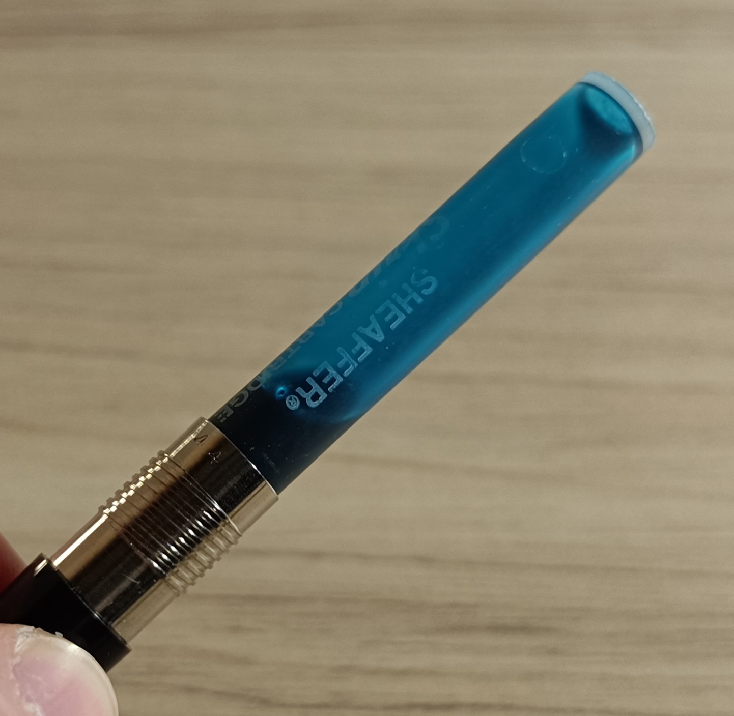 Il sistema di caricamento è il pratico cartuccia/converter: la penna mi è stata venduta con il suo converter (modello con sacchetto e barretta di pressione) ma ho preferito caricarla con una cartuccia riempita con la siringa (attacco proprietario Sheaffer, mi tengo strette le cartucce vuote dato che non si trovano più facilmente). Sia la filettatura della sezione che quella interna al fusto sono in metallo.