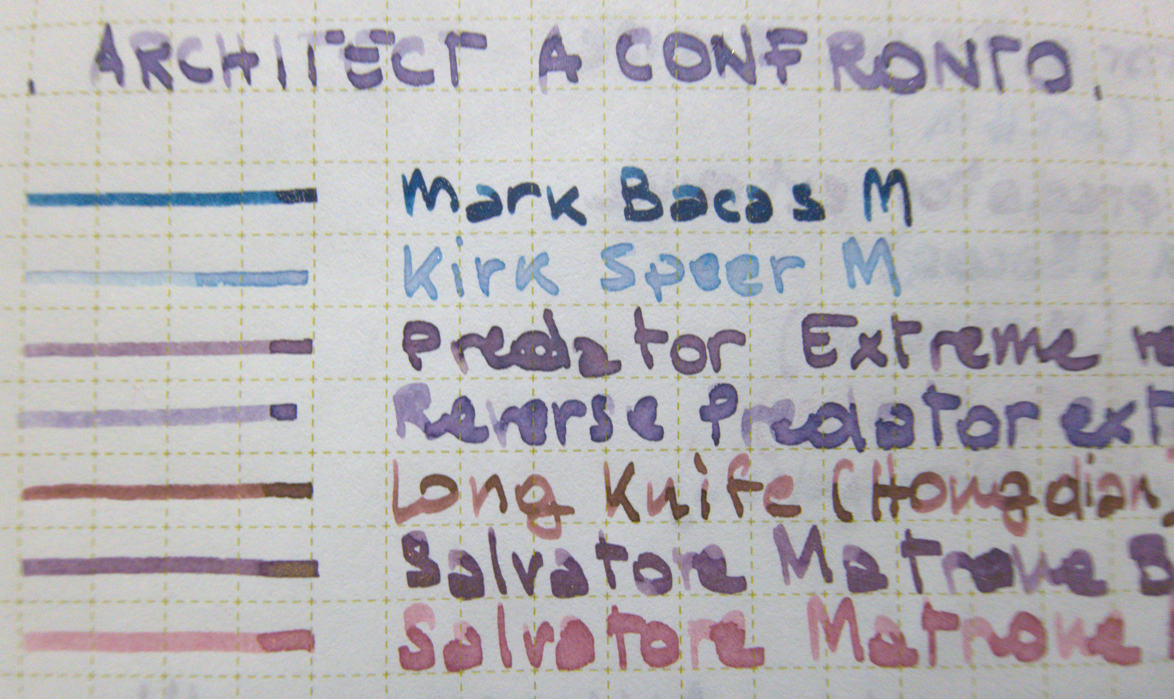Esperienza di scrittura con pennino rovesciato: è strano girare la penna e scrivere normalmente, non è qualcosa che sono abituata a fare. Dopo la prima sensazione di disorientamento - del tutto psicologica, nella rottura delle abitudini - ci si può godere un architect eccellente, ben raffinato, senza spigolature nella limatura. Ho cercato di capire quanto è grande il tratto architect e mi è parso più vicino a un M nonostante io mi aspettassi un F. C'è da dire che l'inchiostro così sciolto può trarmi in inganno. Dopo, comunque, inserisco confronti con altri architect che ho.