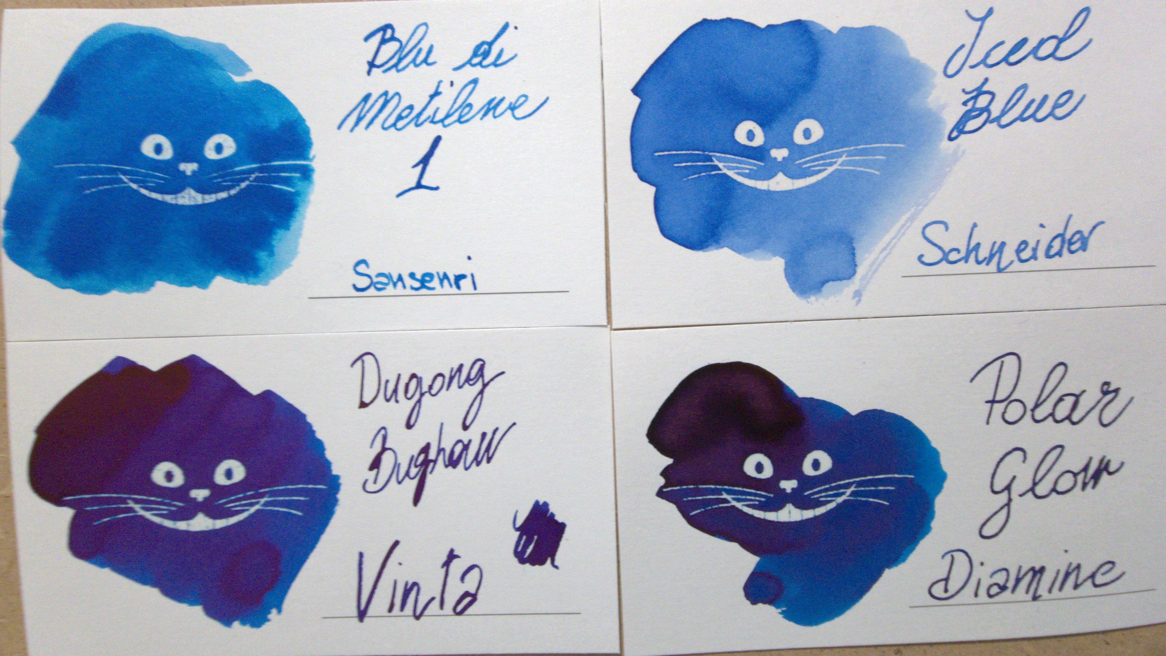 Non essendo un'utilizzatrice di queste tonalità di blu, non ho molti confronti da fare e la diversa tonalità che assume sulle swatchcard di Wearingeul mi toglie anche più possibilità di confronto, avendo io più blu caldi che freddi. La base vista su questa carta, tuttavia, non è molto diversa da Polar Glow di Diamine e da Dugong Bughaw di Vinta [QUI: viewtopic.php?t=32890 ], sembra una versione più chiara di questi e meno pigmentata.