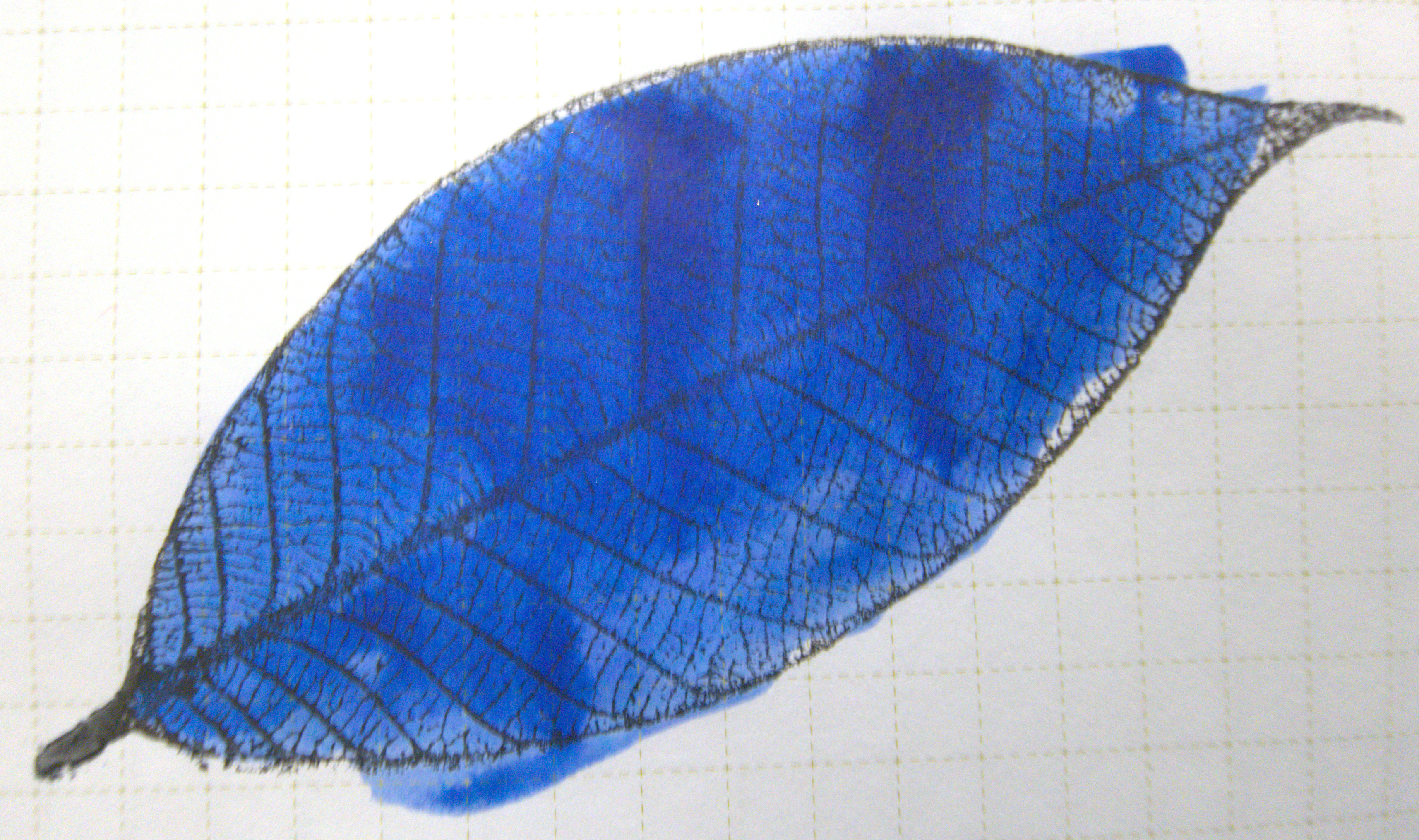 Su Tomoe River (la foglia) è un blu neutro, su Impression di Wearingeul (il gatto) emerge un sottotono verde che lo raffredda facendolo tendere a un turchese.