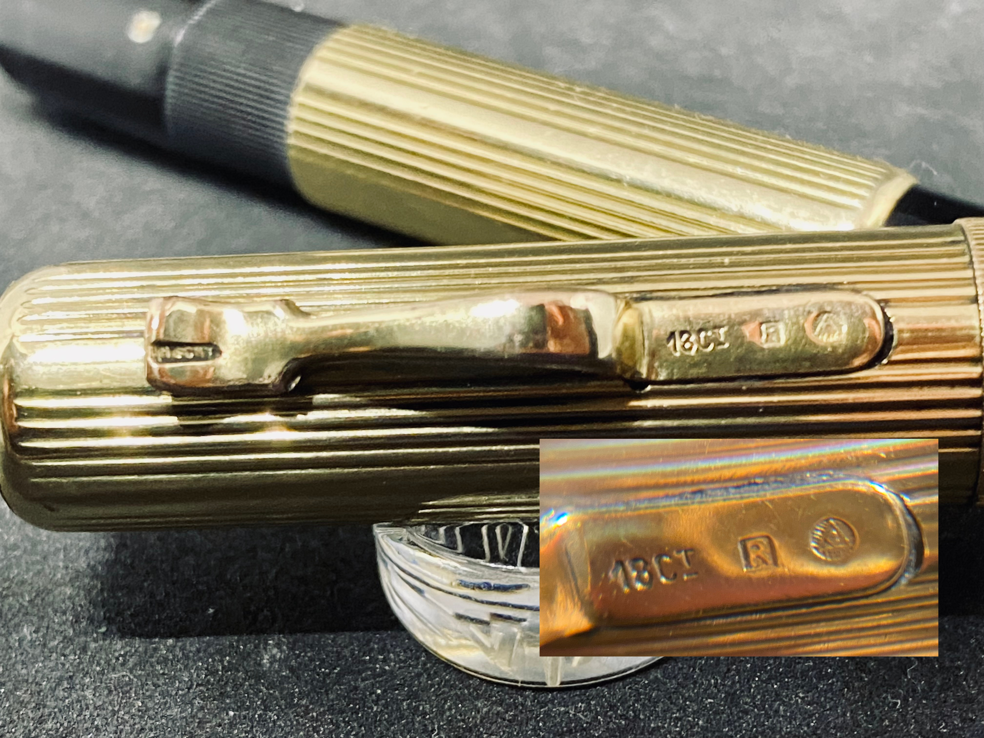 Che sia in oro massiccio lo si capisce dalla incisione sulla sommità della clip: 18ct con dei piccoli simboli che indicano il produttore del rivestimento. Tanto bastava all’epoca per indicare che l’intera penna era rivestita in oro massiccio. Purtroppo non sono riuscito a identificare il significato dei simboli, se qualcuno (Esmeeeee) riesce a fare luce gliene sarei grato.