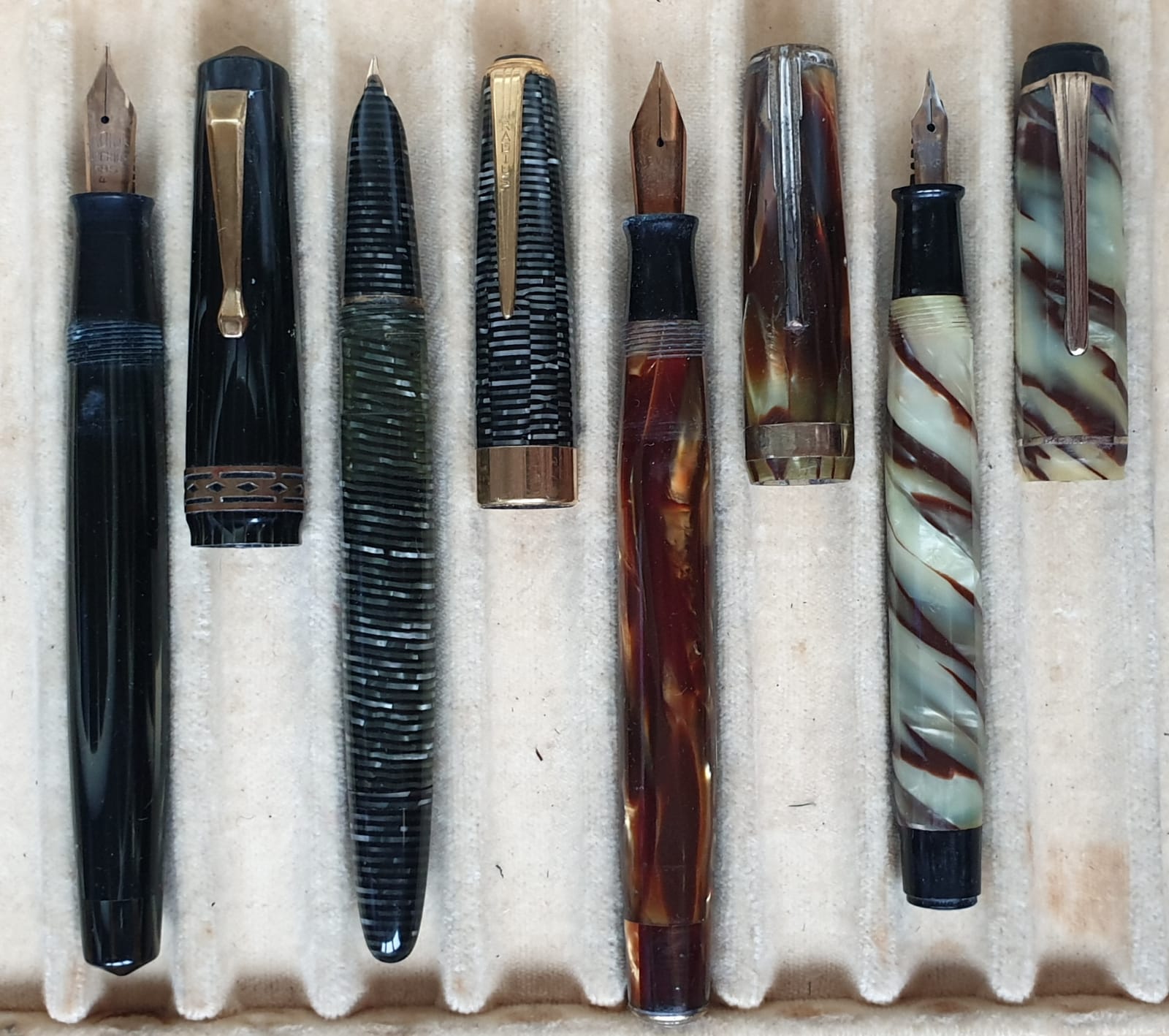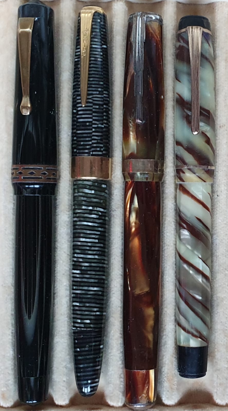 Quattro belle italiane in celluloide tornita da barra, non "accartocciate" (sono penne realizzate arrotolando un foglio di celluloide e, infine, incollandone i lembi).