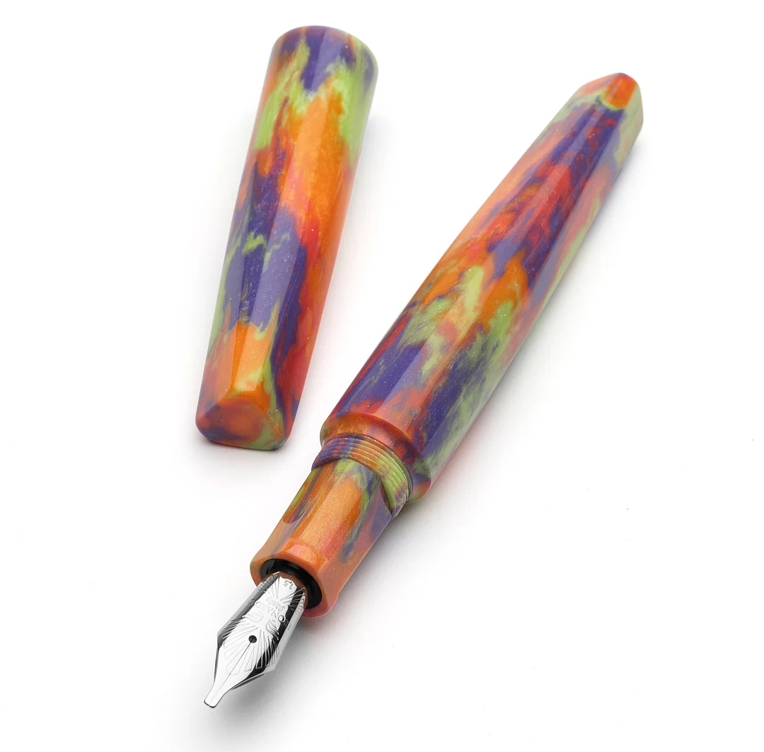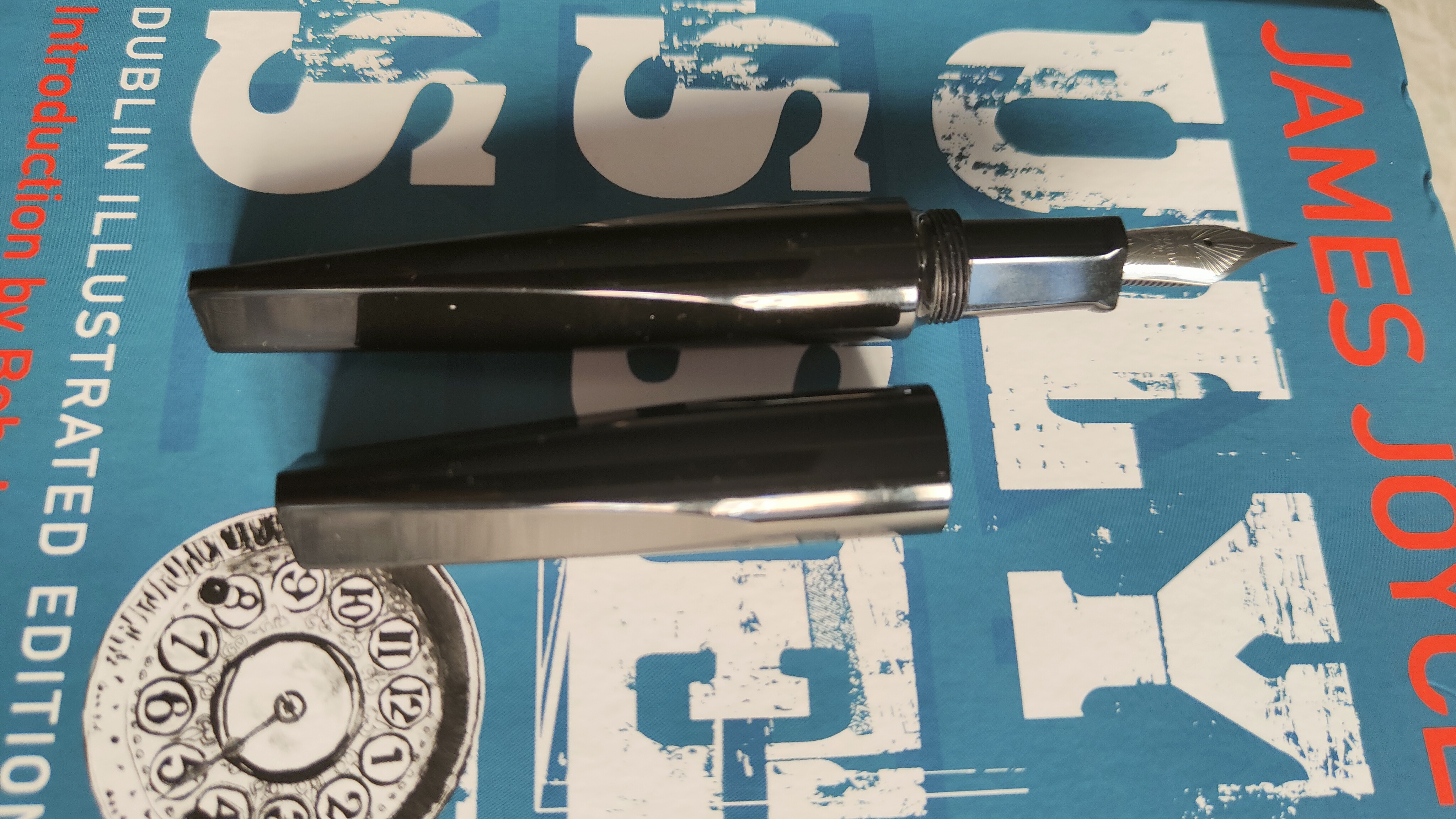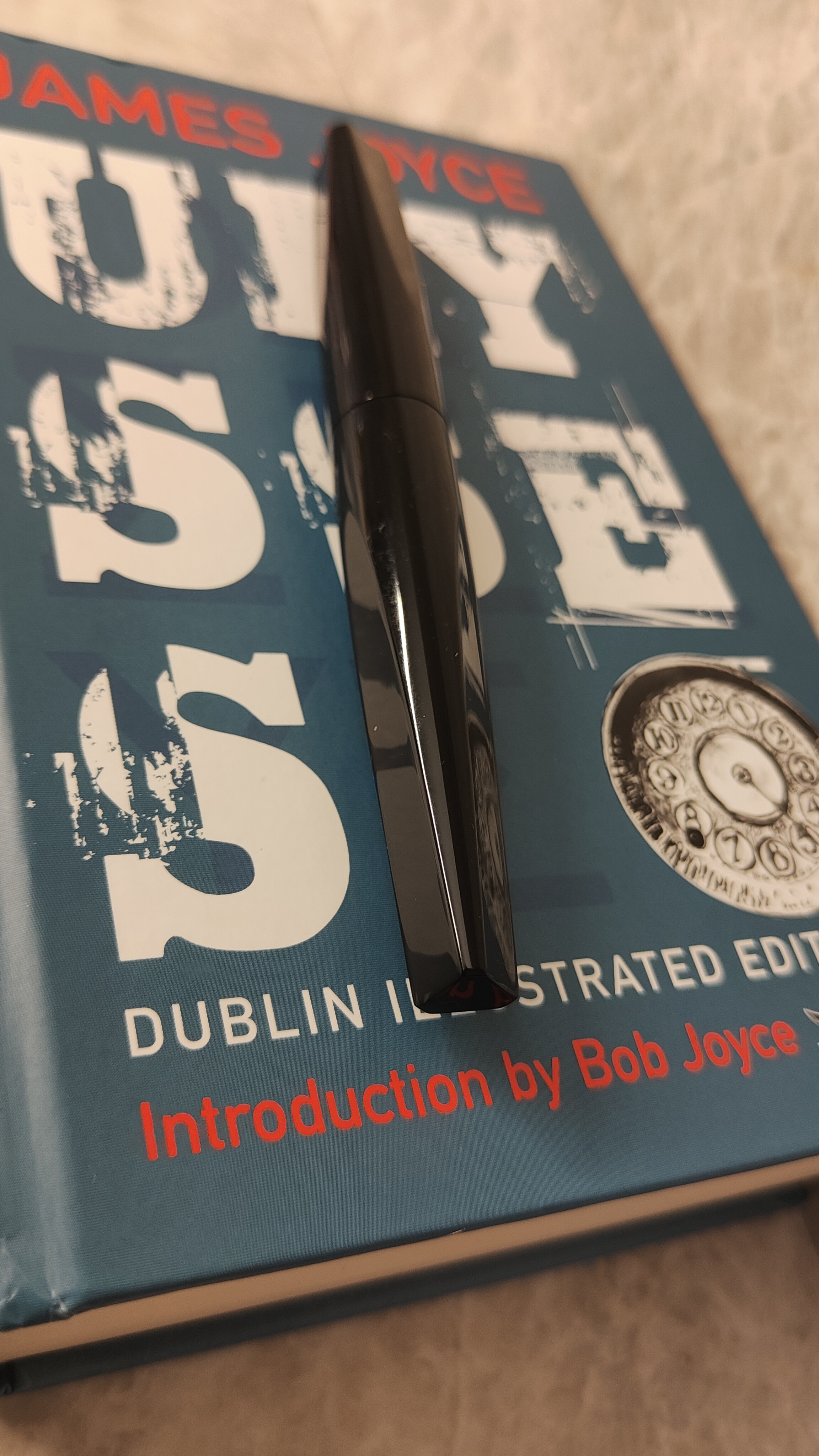La poliedrica è stata fatta sia con sezione tonda che con sezione triangolare. La mia è triangolare. La resina è di ottima qualità: lucida, bella al tatto. Chiusa è cilindrica al centro e poi all'estremità diventa triangolare, con le facce molto nette e definite. Una volta aperta non è la penna per chi teme il famoso gradino che è presente e gli fa seguito una filettatura molto stretta. A me la sezione non crea nessun problema, anzi trovo la penna fantastica da tenere in mano anche grazie al bilanciamento perfetto. Il caricamento è a cartuccia/converter ed è possibile usare anche le cartucce lunghe. Quando si osserva la penna svitata, si prova una grande soddisfazione per quanto sia spessa, ovvero per quanta resina ci sia. Smontata mi dà l'idea di essere indistruttibile. Il cappuccio è fatto come gli altri di Leonardo, con tre diversi spessori, sempre più spesso in corrispondenza del pennino. La penna può rimanere carica e non utilizzata per giorni e giorni e al primo utilizzo non mostra nessun problema di ripartenza. La mia è carica col Noodler Black Swan in Australian Roses che secca in modo atroce ma con questa Poliedrica non ho mai avuto nessun problema. Il flusso, perfettamente dosato, permette di godere della pienezza di questo colore difficile, anche col tratto EF. Il pennino è in acciaio con l'alimentatore in ABS ma non è avvitato bensì a frizione, e non l'ho mai smontato perché è uno dei pennini più belli che possegga per flusso, leggero molleggìo e feedback. Si tratta del solito JoWo marchiato Leonardo ma probabilmente è stato testato e messo a punto in fase di montaggio perché è davvero qualcosa di speciale tra i miei pennini rigidi "ordinari". Di seguito una prova di scrittura: