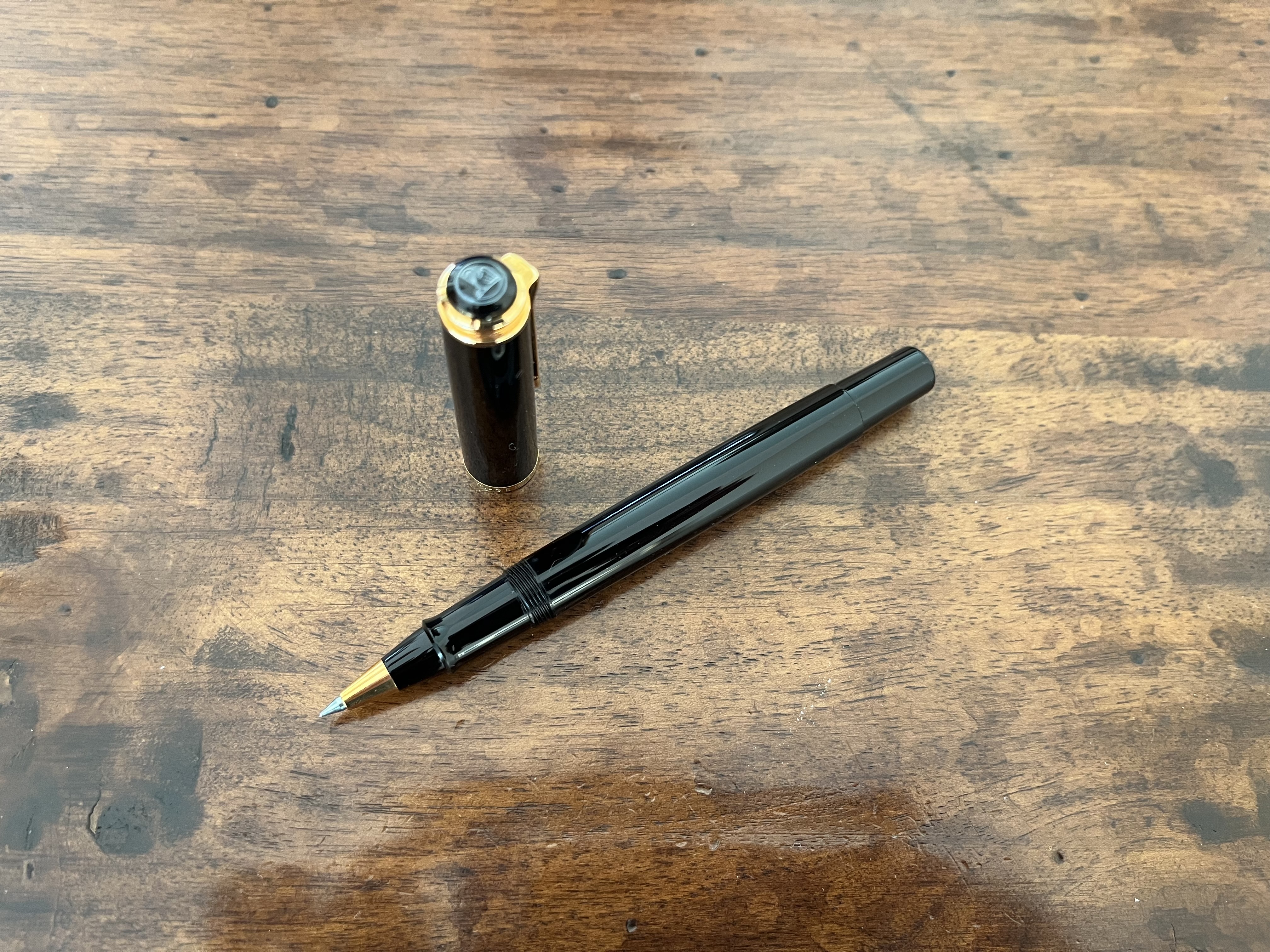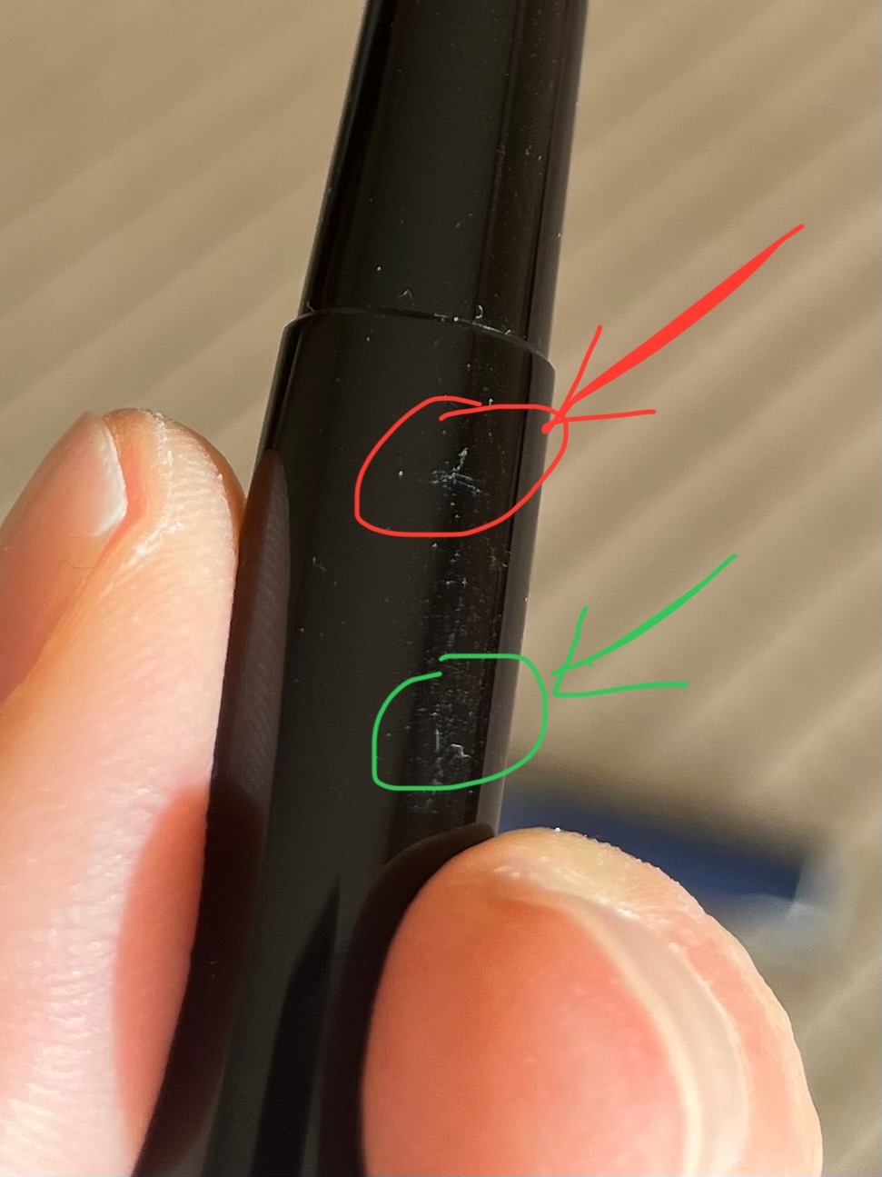 Ho appena comprato, ad una svendita fallimentare, un roller Pelikan R400 a prezzo stracciato - il mio piano è farne il compagno da ufficio, da usare con cura ma ogni giorno: ho già una Montblanc che riposa perennemente nel suo astuccio, quindi punto a vivere maggiormente almeno questa penna. È nuovo ma con un minuscolo segno sulla resina, che vi mostro - ho messo la penna controluce perché si vedesse: mi spiace per i riflessi delle onnipresenti ditate. Per darvi un’idea della scala e della profondità,