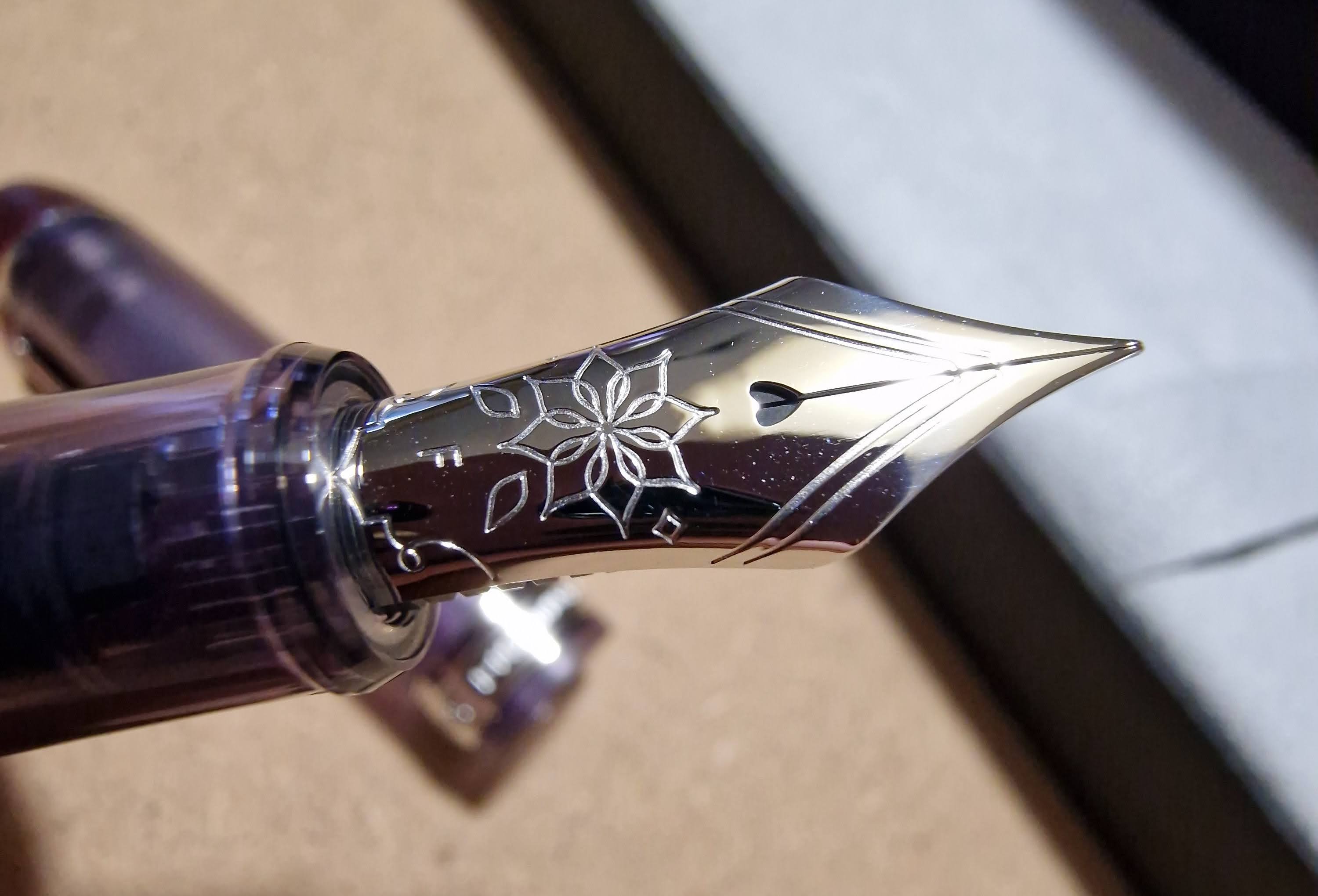 Il pennino è personalizzato. Oltre ad avere la tipica bordatura nella forma del profilo del monte Fuji, ha l'incisione della versione stilizzata di un fiore di Clematis. Molto bello.