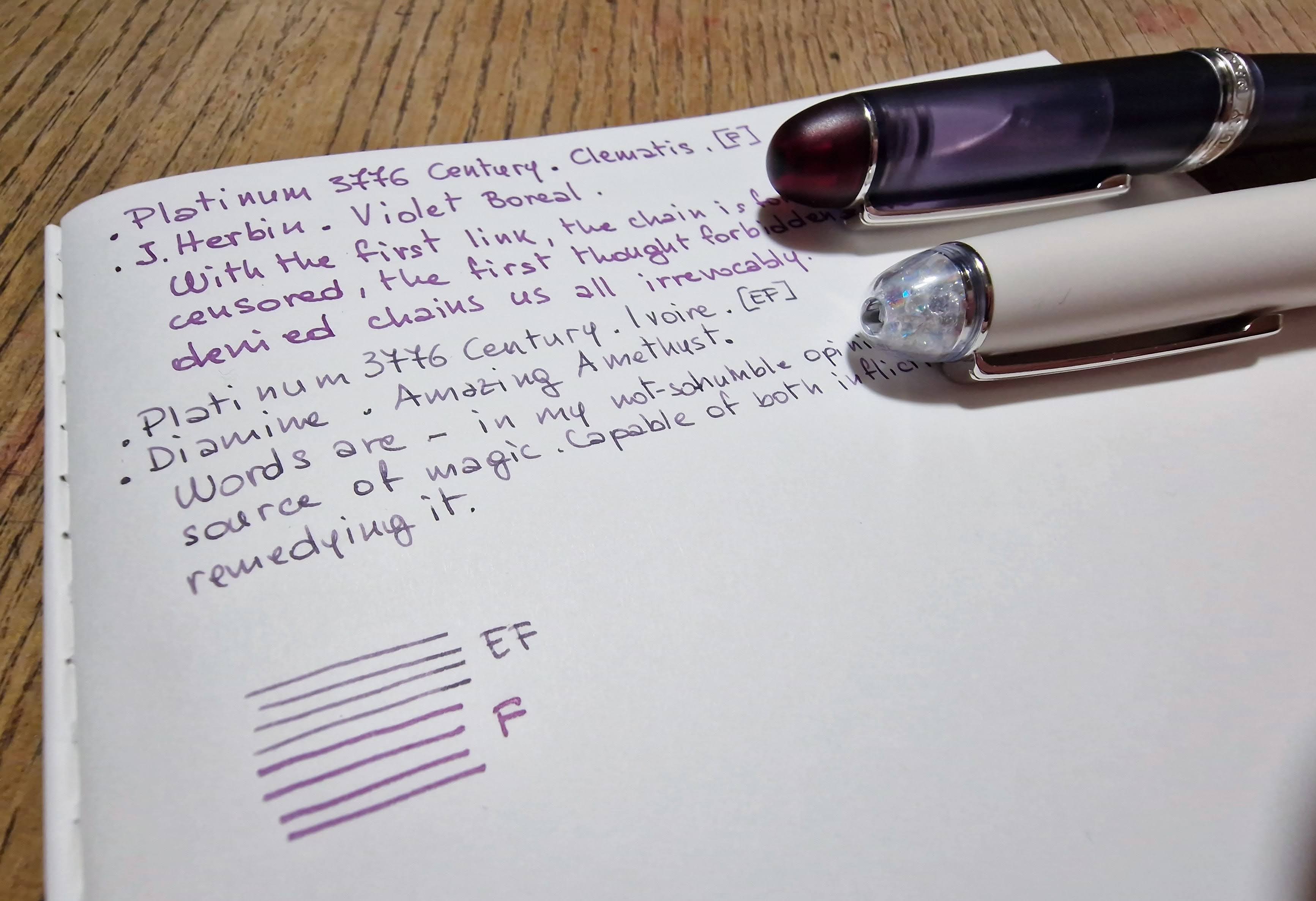 Ho fatto un confronto con una EF caricata con Amazing Amethyst di Diamine, un inchiostro anch'esso non asciutto.