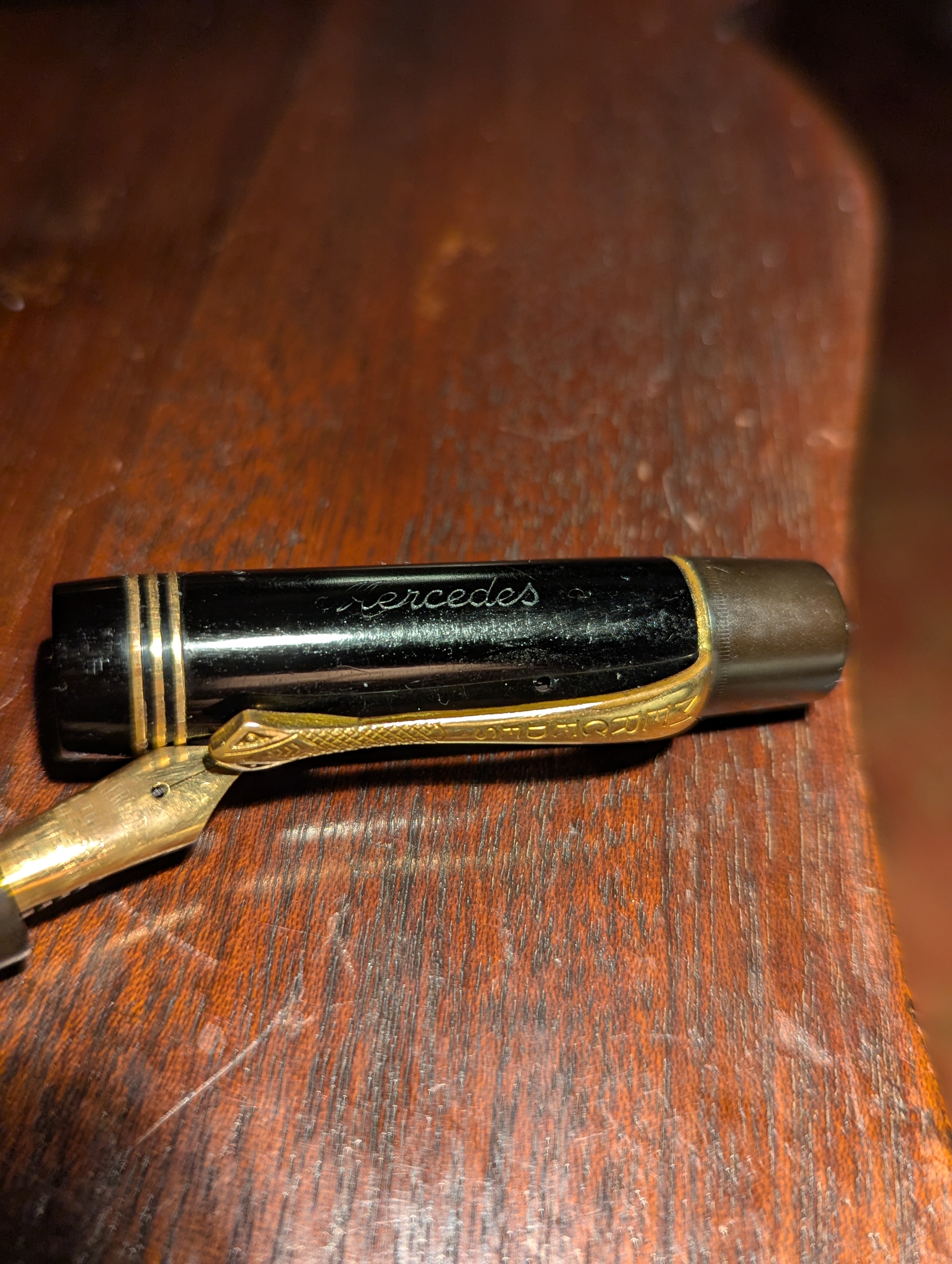 Raccolgo la sfida e metto le foto di questa Mercedes, trovata oggi su una bancarella di Monaco di Baviera insieme a una Ero, inopinatamente inserita nello stesso astuccio mono: ha degli strani segni sul fondello (numero 10 e scritta) e una scritta (pubblicitaria ?) sul fusto. Plastica scolorita su sezione e fondello (come l'Aurora 88).