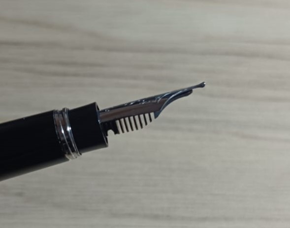 Siamo giunti dunque al pennino: si tratta di un pennino in oro 14 carati, piccolo ma non piccolissimo: confrontandolo con un Bock numero 5 ha più o meno la stessa lunghezza, ma è più stretto. Sui rebbi vicino alle punte vi sono dei decori molti classici, un piccolo foro di sfiato circolare, il numero 4810 (quella che era considerata l’altezza del Monte Bianco all’epoca dell’introduzione di questa incisione), il logo della Montblanc, la dicitura “14K”, la scritta “Montblanc” (nel caso avessimo la memoria di Dory e ce ne fossimo dimenticati) e “585” (l’espressione in millesimi dei 14 carati). Un pennino, dunque, piuttosto ricco di particolari nonostante le dimensioni ridotte. Al di sotto del pennino è presente un alimentatore in ABS a lamelle.