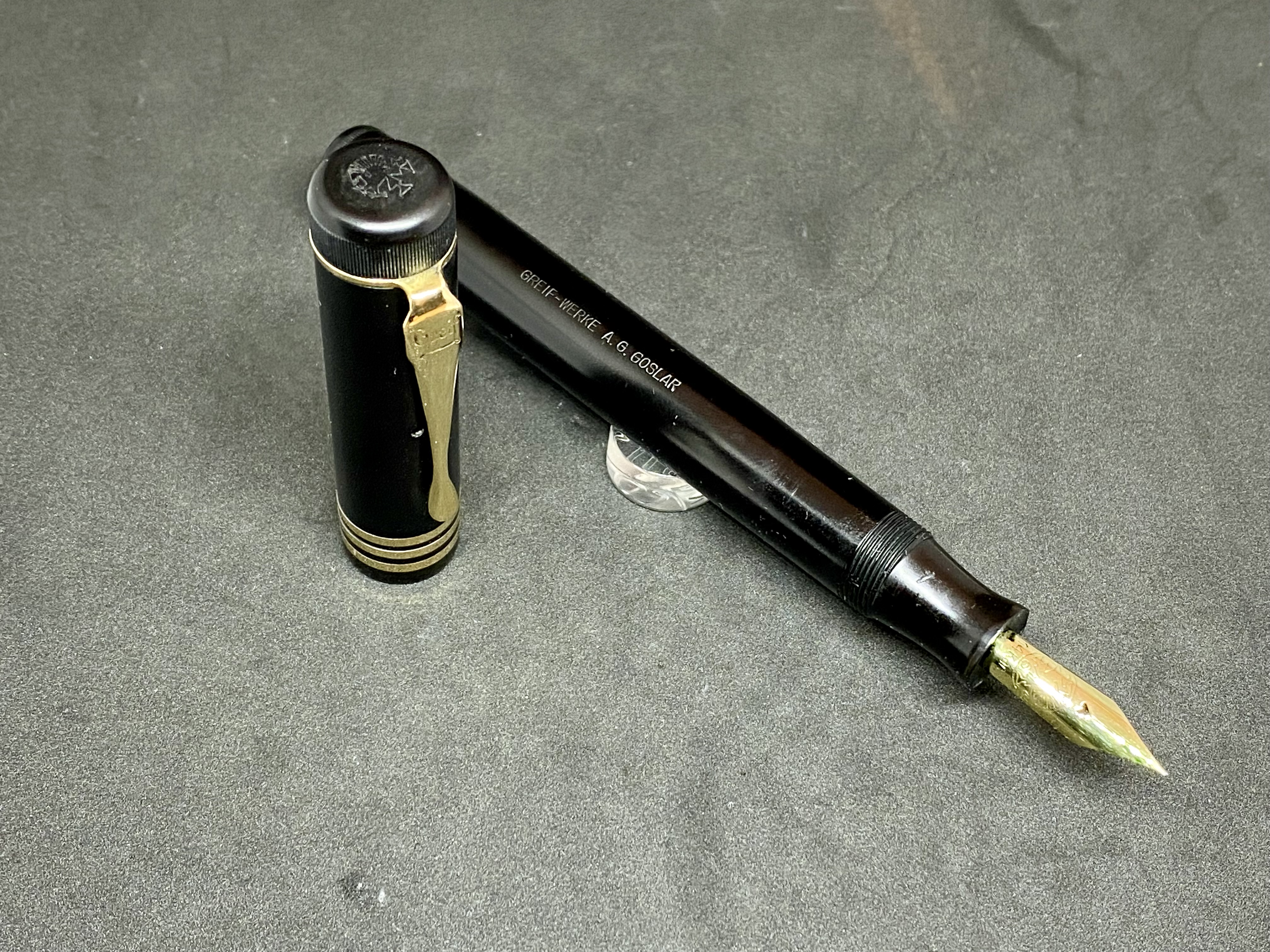 Pur essendo tedeschi e producendo penne dalla linea sobria, si sono anche lanciati in dettagli originali. Ad esempio, su penne tutte nere e dalla linea rigorosa, come la tua, avevano inserito sul cappuccio degli anelli in celluloide verde giada o rosso marmorizzato, sotto la veretta o nell'innesto della testina.