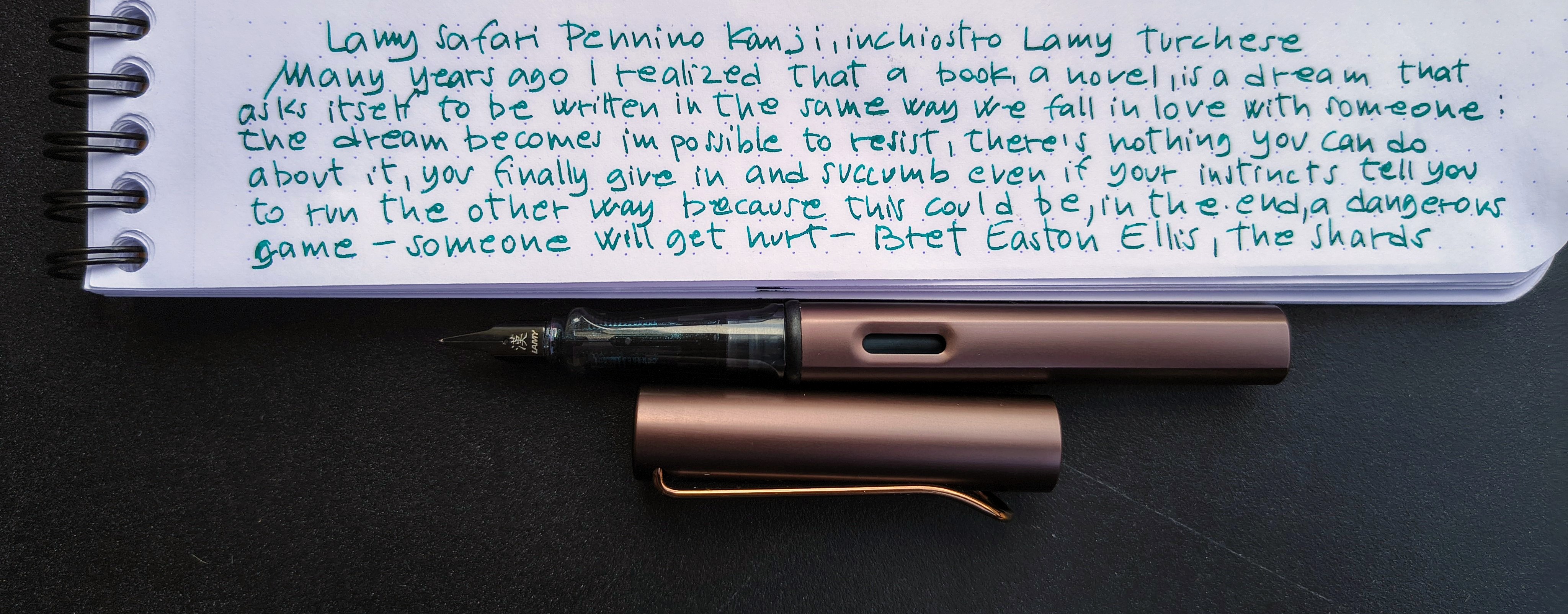 Per scrivere la recensione della Leonardo Aluminia ho rispolverato le altre penne in alluminio in mio possesso, tra cui la Lamy Safari al bronze che monta il pennino Kanji di Lamy. Non l' avevo mai usata per non rovinarla (è un regalo di un caro amico del forum) e perché il pennino Kanji quando lo avevo provato non mi aveva detto granché... Non so come sia possibile, ma l' ho riprovato e mi sono chiesta come avesse fatto a non piacermi! Certo che col tempo io ho fatto dei cambiamenti sorprendenti, dall' inclinazione della penna che mi costringeva ad usare pennini obliqui alle misure dei pennini, non lo avrei mai detto di me :)