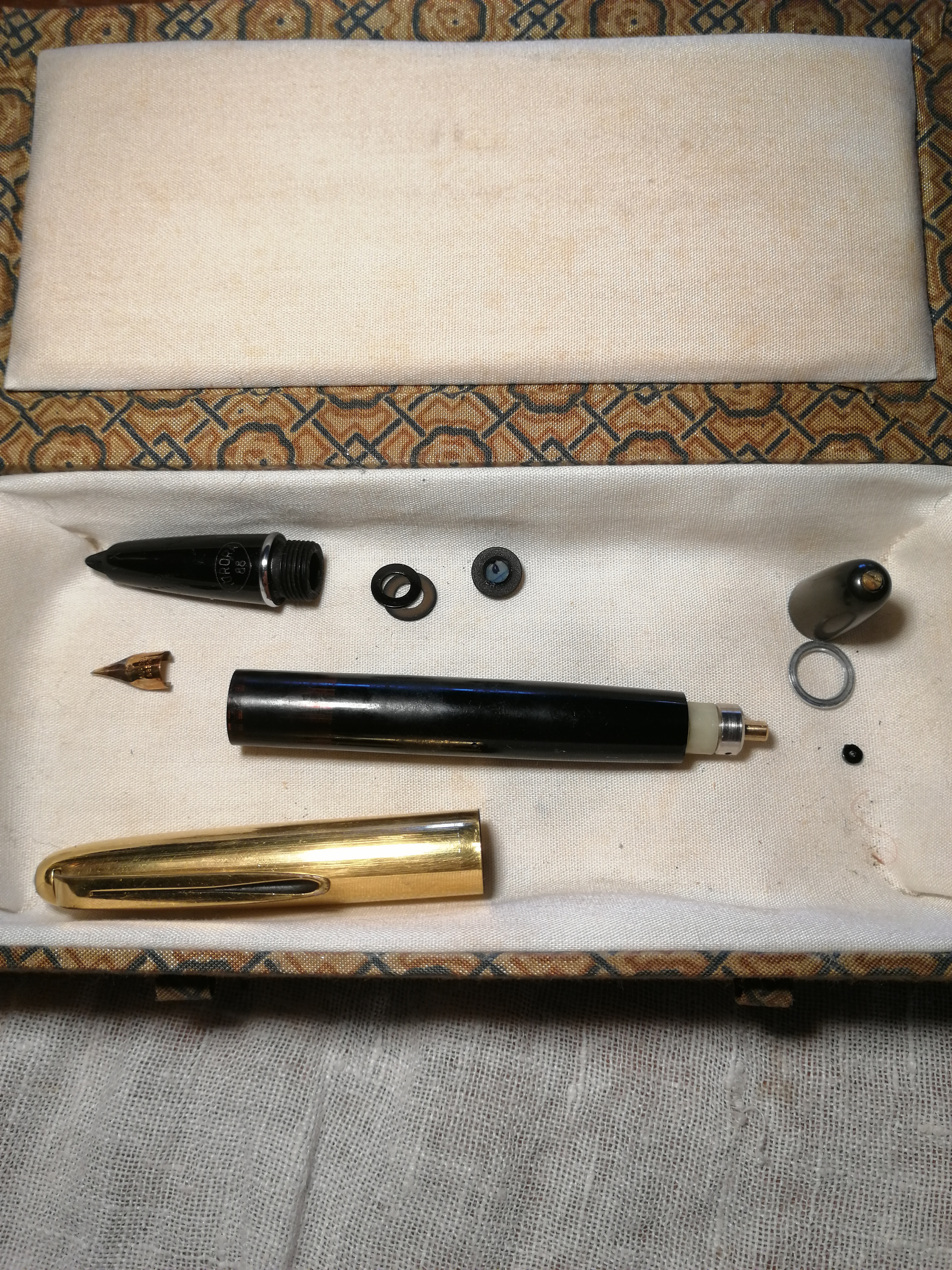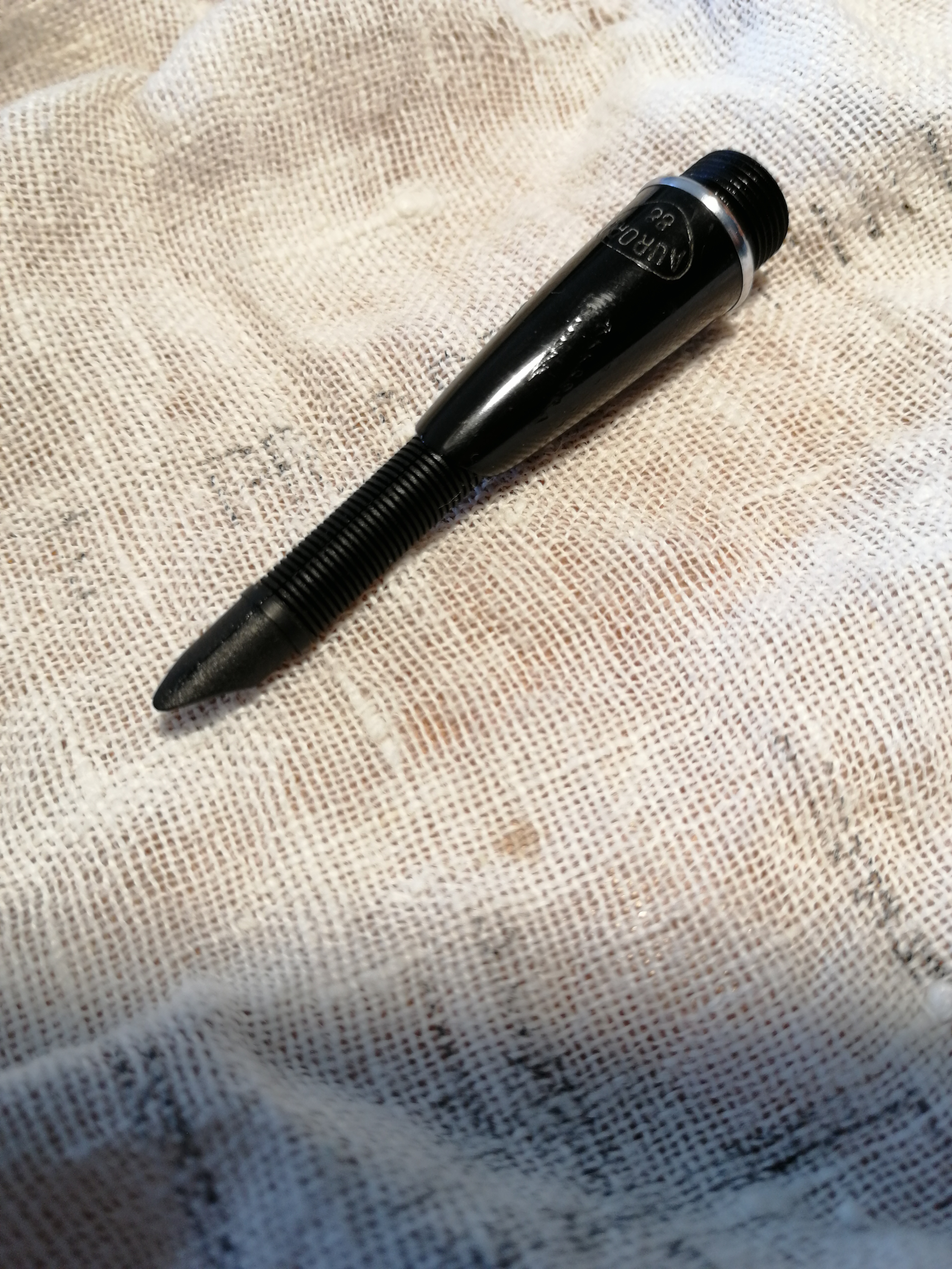 In un mercatino fra le pulci ho riconosciuto la scatola blu dell'Aurora88, come dicevo nella mia presentazione, l'ho presa ad un prezzo ridicolo. A casa l'ho immersa intera in acqua tiepida. Usciva inchiostro blu, ho provato a scrivere ed andava benissimo. Il pennino sembra perfetto. Farò foto macro, in quelle che ho fatto non si vede niente. L'ho tolto facilmente e delicatamente.
