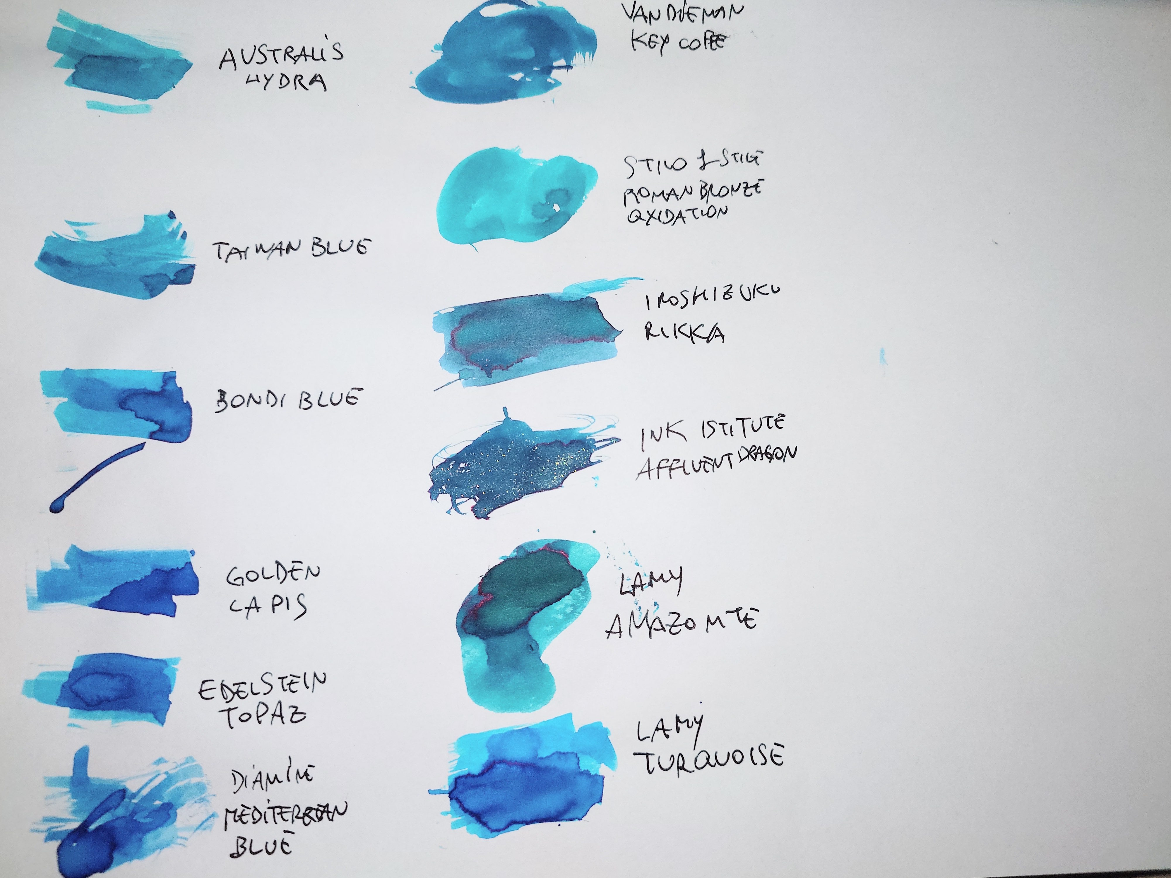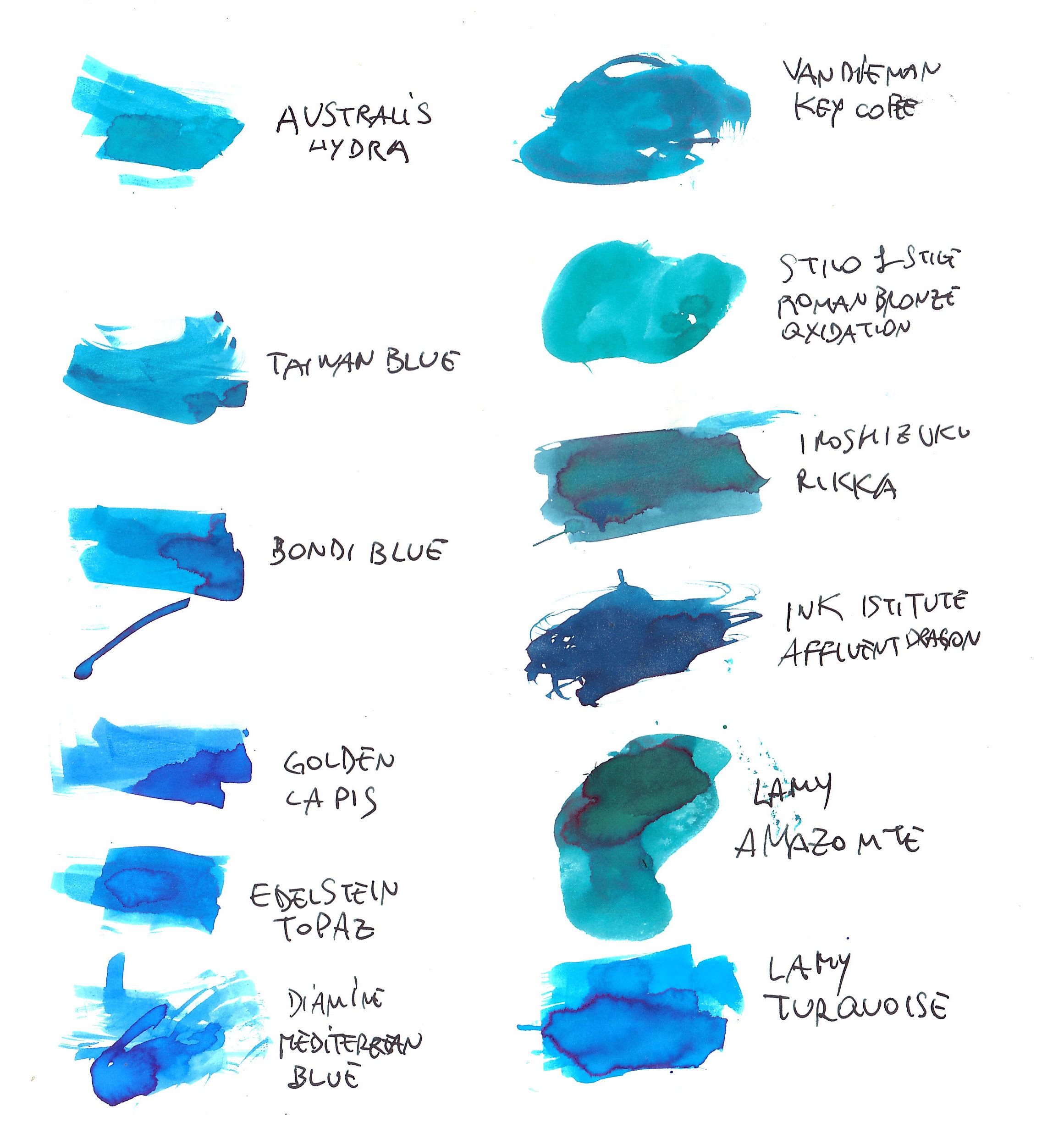Un comportamento simile lo ha anche il Monteverde Horizon, che rispetto al Asa è tuttavia ancora più blu come colore base, e molto simile è anche il Diamine Blue Velvet (sono più blu che altro, ma le sfumature turchesi si notano).