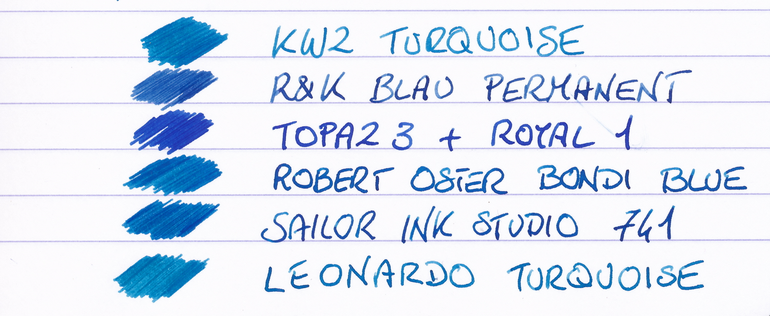 A confronto il Blau Permanent di R&K è più blu, ma mostra comunque quel pizzico di turchese nelle sfumature (lo uso da lungo tempo).