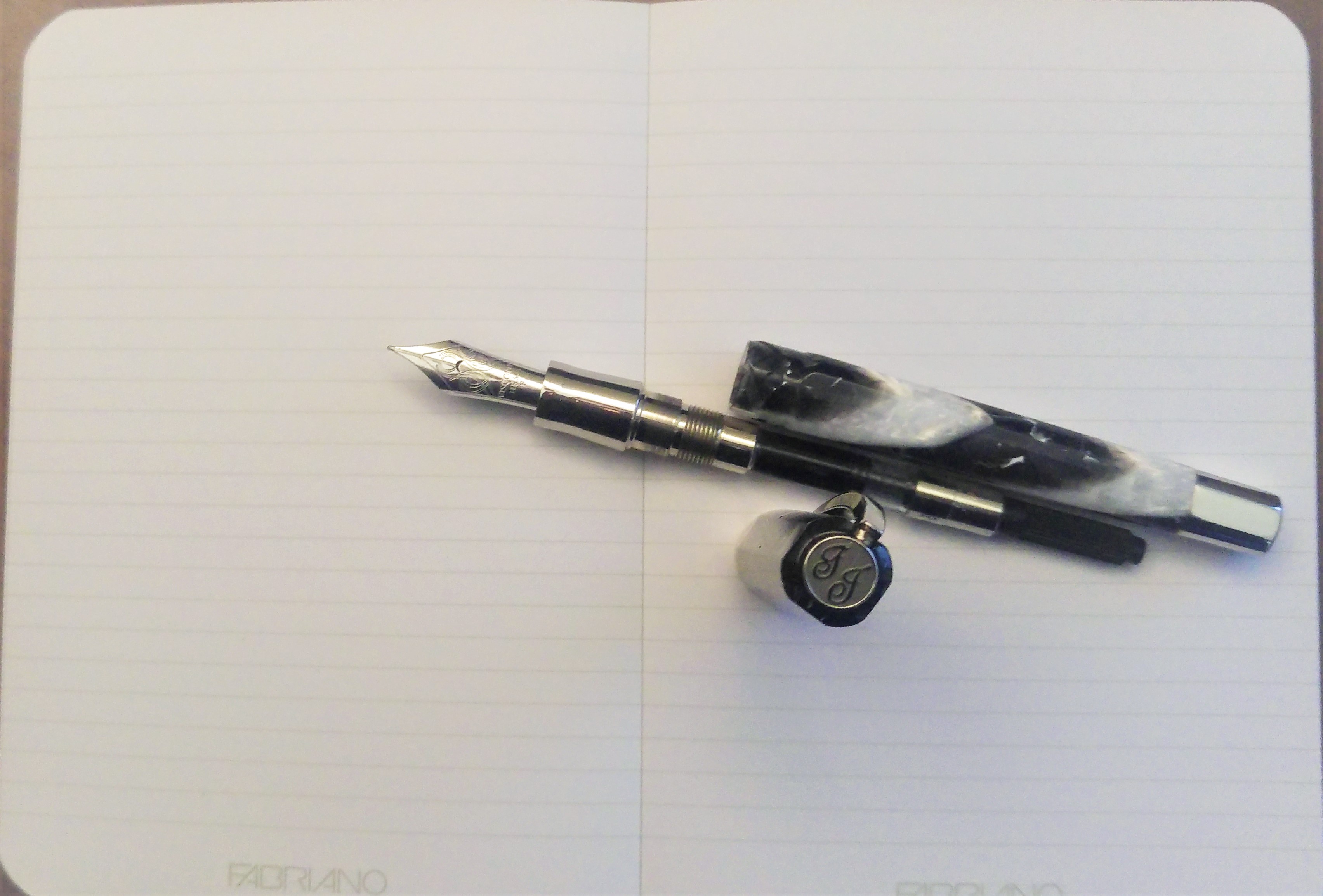 Trovo la penna oltre che bella e solida, il cappuccio usa il sistema a baionetta che consente di mantenere le facce tra cappuccio e fusto sempre allineato, la clip è caricata a molla e sul cappuccio ha il sistema Visconti My Pen su cui ho messo le mie iniziali. Il sistema di caricamento è a cartuccia/converter con montaggio a vite, semplice economico e funzionale. La sezione metallica è a mio parere il solo neo di questa penna, non tanto per una questione estetica quanto funzionale, benché la penna sia molto comoda e ben bilanciata, diventa un po' scomoda in lunghe sessioni di scrittura per chi, come me, ha la tendenza a sudare sempre un po' le mani. Il pennino è un #6 14K di misura F nel mio esemplare; io lo trovo più piacevole del dreamtouch al palladio, è più scorrevole, è bello morbido, permette un po' di variazione del tratto (ma su questo il dreamtouch non è da meno), ha un flusso più controllato ed un tratto più “giusto”, l’F della Opera Elements è più sottile del EF del 23K al Palladio che ho sulla Divina.