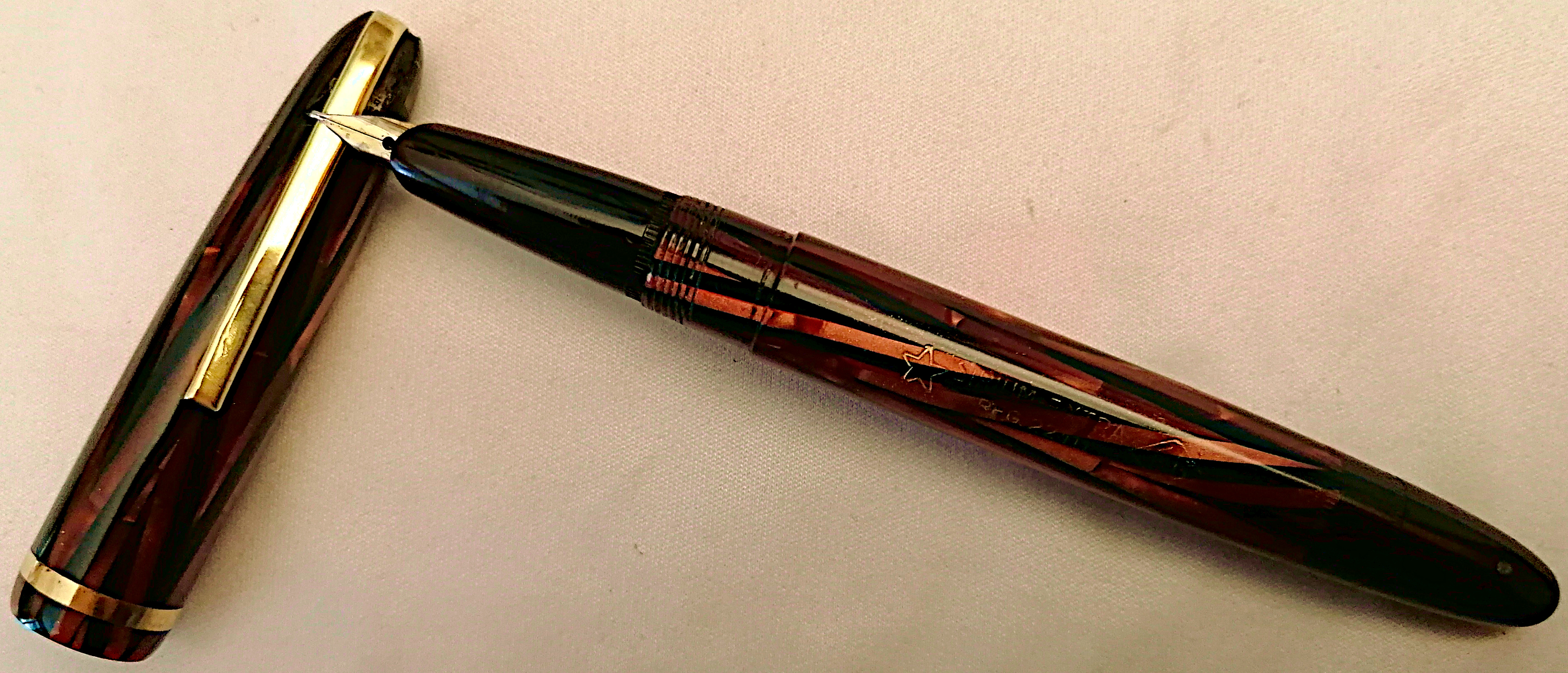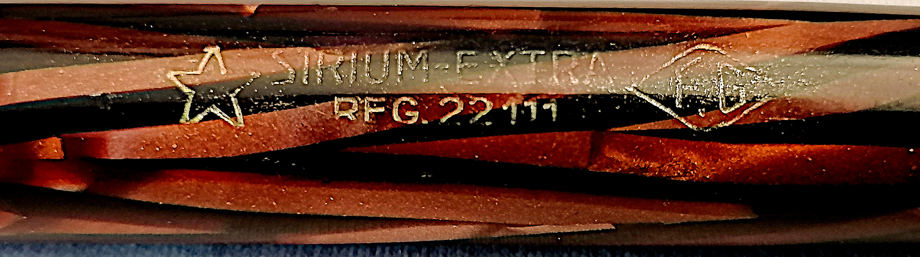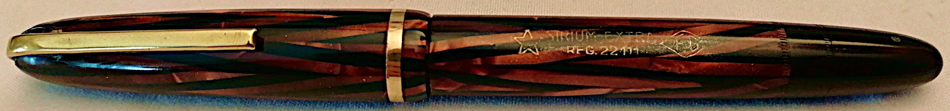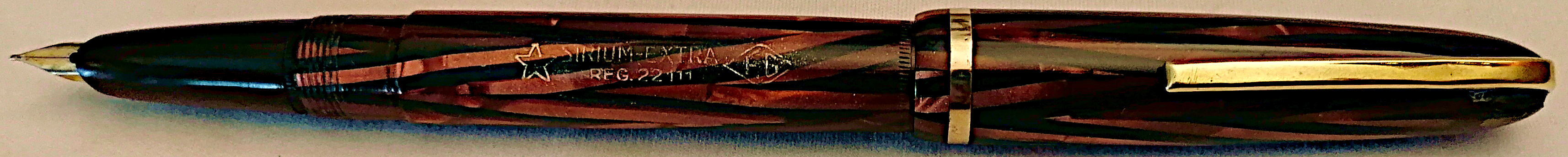 Buongiorno, acquisto fortunato ad un mercatino domenicale: si tratta di una Sirium Extra che mi ha attratto per la celluloide che, come in altre occasioni, ero quasi certo poter far tornare alla sua luminosità originale. E' stata gentile, il sistema di caricamento ha resistito al mio smontaggio per mettere una nuova guarnizione in sughero, le finiture molto ossidate sono tornate dorate come appena nata. Ho cercato altri modelli della Sirium Extra e, ammesso che abbia cercato a sufficenza, non ne ho trovata un'altra con il pennino carenato come questa (pennino che nonostante punte un po' troppo consunte, scrive in modo più che accettabile).