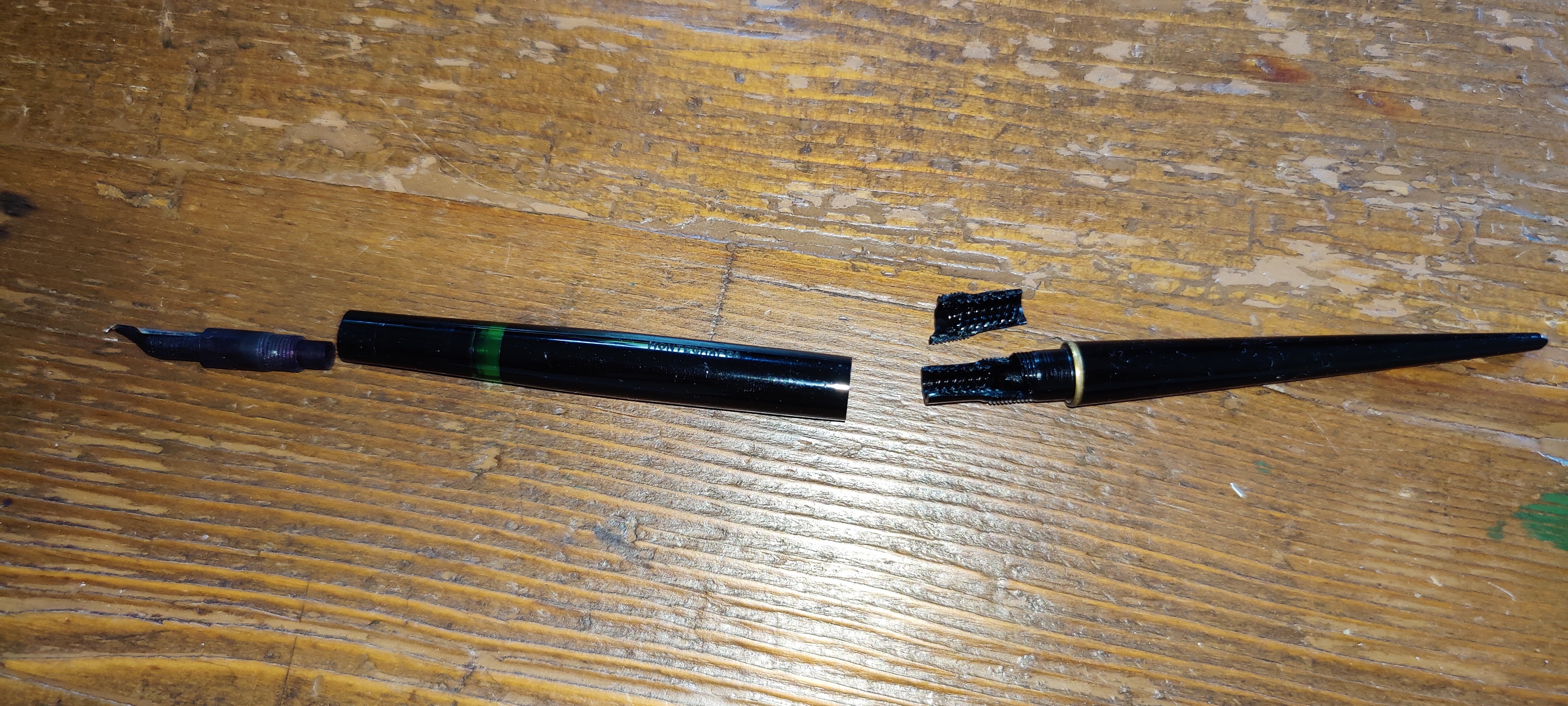 In poche parole : qualche anno fa mi è stato regalato uno stiloforo Montegrappa, azienda di Casa (da che ho capito in celluloide), con base in vetro omas, da un ex- collega (era suo, quindi usato). Nell bel mezzo dei traslochi non mi sono messo a guardarlo e provare a sistemarlo, ma ora che ho tempo.. Insomma, a me piace cercare di riparare tutto, me la cavo parecchio bene ma temo sia un po' improbabile in questo caso.. La base dopo averla pulita e lucidata è decisamente super, apparte qualche sbeccatura sugli angoli del cristallo, ma ce se ne fa una ragione.. Ma cercando di aprire lo stilografo mi sono accorto che qualcosa non andava, faceva resistenza a scatti, e una volta aperta del tutto, mi son trovato nella situazione che vedrete nelle foto.. C'è modo di ripararla? Ci tengo veramente molto e mi dispiacerebbe doverla buttare via.. Se proprio è impossibile in casa, immagino non sia conveniente portarla da un restauratore professionista visto il prezzo abbastanza modico..in quel caso qualcuno sa dove potrei trovarne una identica, almeno per ricordarmi Dell originale? L'obbiettivo mio sarebbe di rimetterla in funzione, ma non me ne intendo di stilografiche, quindi non vorrei fare ancora più danni.. Grazie ancora per le eventuali risposte e lo spazio, e scusate per il Wall of Text
