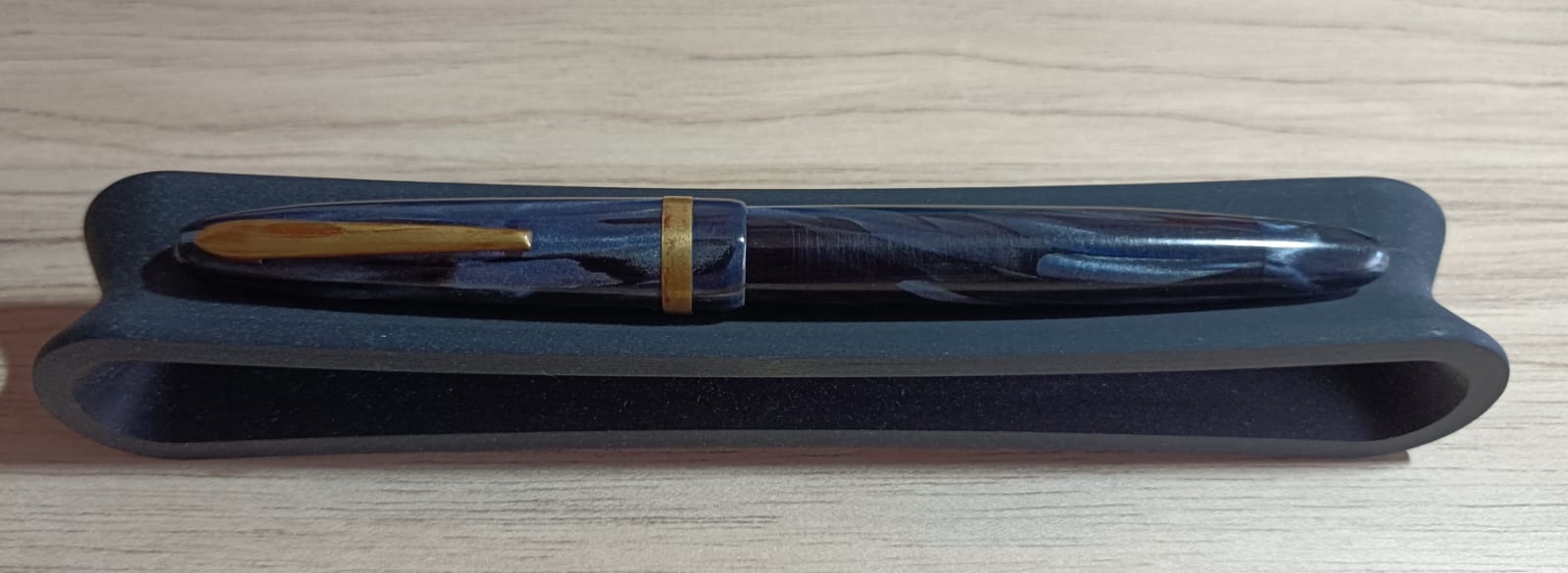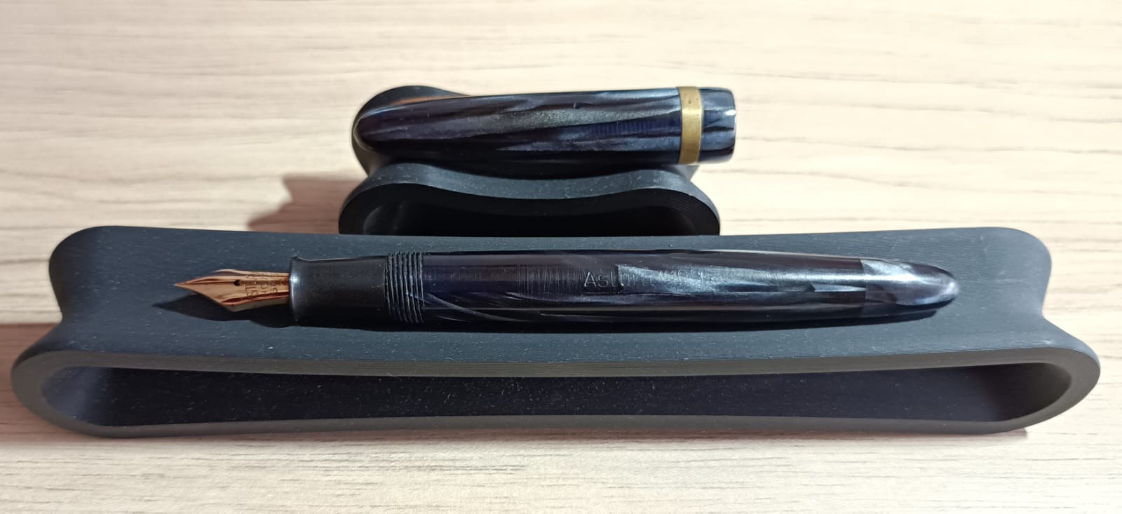 Ma veniamo alla penna vera e propria, cominciando come sempre dalla descrizione esteriore: si tratta di una penna dalle forme a sigaro realizzata in celluloide screziata blu e nera. Nel materiale notiamo la prima nota di "economicità": non raggiunge le vette della celluloide arco in quanto a bellezza e a profondità, cionondimeno, ha una bella colorazione, mi piace questo blu-grigio. Sul cappuccio troviamo un fermaglio che inizia con una punta e prosegue restringendosi fino alla fine. Poco prima del labbro del cappuccio troviamo una banda metallica dorata. Il corpo prosegue dritto (non noto curve di sorta) fino al fondello che termina a ogiva come il cappuccio. Sia la sommità del cappuccio che il fondello non terminano in verità con una ogiva perfetta, ma presentano una punta, come un residuo della lavorazione dalla barra; credo che questo sia un altro segno del segmento di prezzo cui era destinata questa penna. Il corpo riporta l'incisione “Astura n° 108” (ben poco visibile ormai, non provo neanche a renderla in foto). Le dimensioni sono: circa 127 mm con cappuccio, circa 112 mm senza, per un peso di 13 grammi con cappuccio e 9 senza. Si tratta quindi di una penna piccola e maneggevole.
