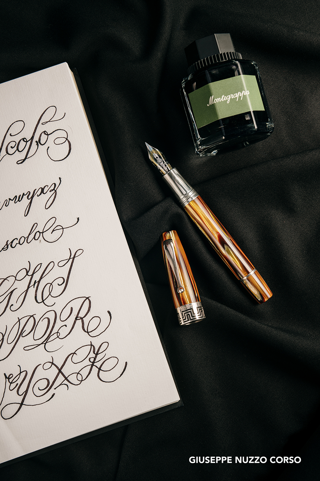 Ogni dettaglio della Extra 1930 incarna l’architettura estetica del Made in Italy: la fascia sul cappuccio traforata con il motivo a greca, segno distintivo di Montegrappa, e le minuterie in argento 925, lucidate a specchio, donano un sottile contrasto metallico che esalta la celluloide senza sovrastarla
