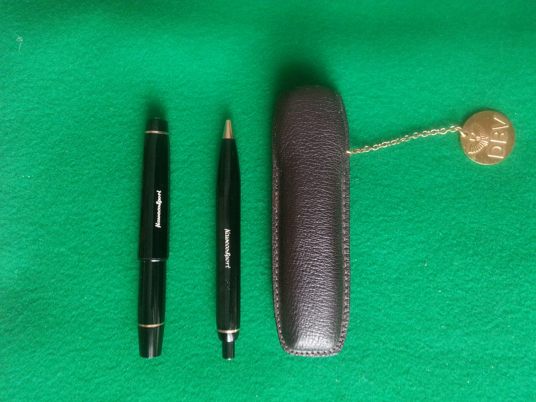 Ecco il mio ultimo acquisto, una prima per me. Una Kaweco vintage v16 con pennino morbido in oro 14k obliquo fine (insieme a una penna a biro dalla forma carina ma la cui utilità per me è zero). Quello che mi ha colpito è la piccolezza della stilografica una vera penna mignon. Io che sono abituato a usare le stilografiche senza calzarle qui mi trovo in difficoltà perché senza cappuccio è veramente troppo corta. Con il cappuccio le cose vanno a posto ma mi ci dovrò abituare.