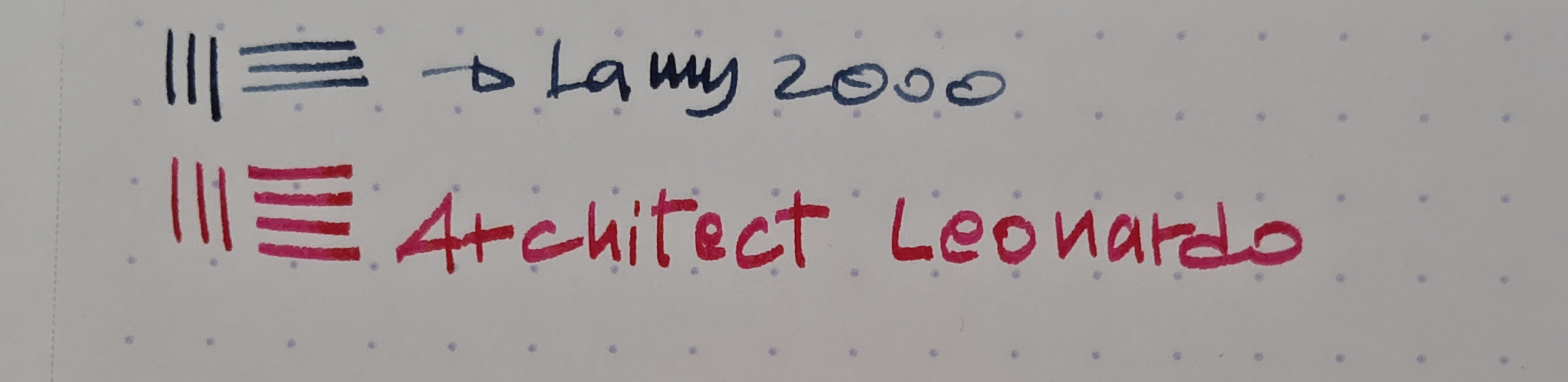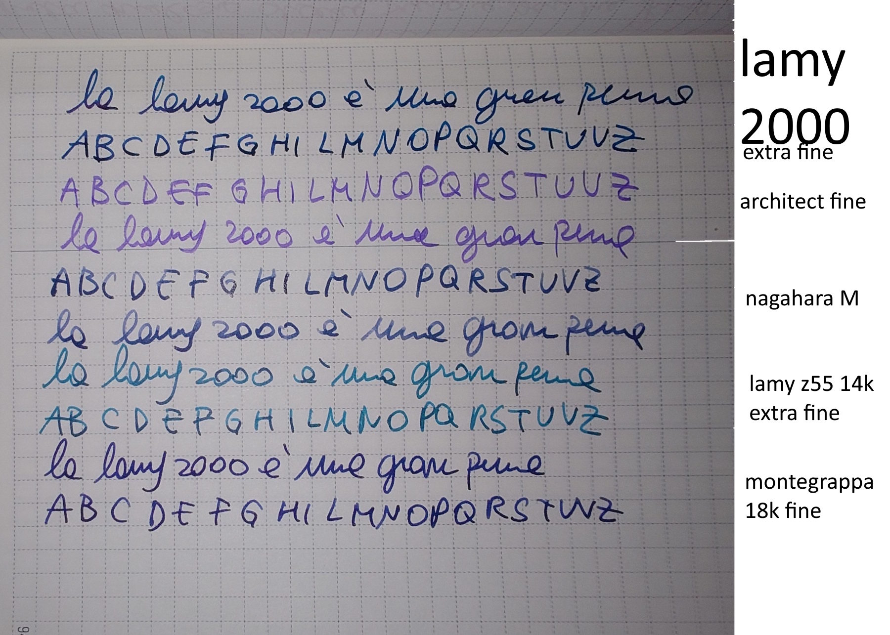 La Lamy 2000 non ha l' iridio tondo, sicuramente non nelle misure EF/F. Definirlo architect però è un po' troppo... nella tua foto i tratti verticali e orizzontali a me sembrano uguali, come per la mia Lamy 2000 EF. Il pennino architect è davvero un altro pennino:Phrancesco ha scritto: ↑domenica 24 agosto 2025, 20:06 Parliamo di una cosa lieve e in certi casi poco percettibile, inizialmente mi ero solo accorto che era un EF diverso da altri EF che ho, solo in seguito, prestando maggior attenzione, ho preso coscienza di questo carattere architect.