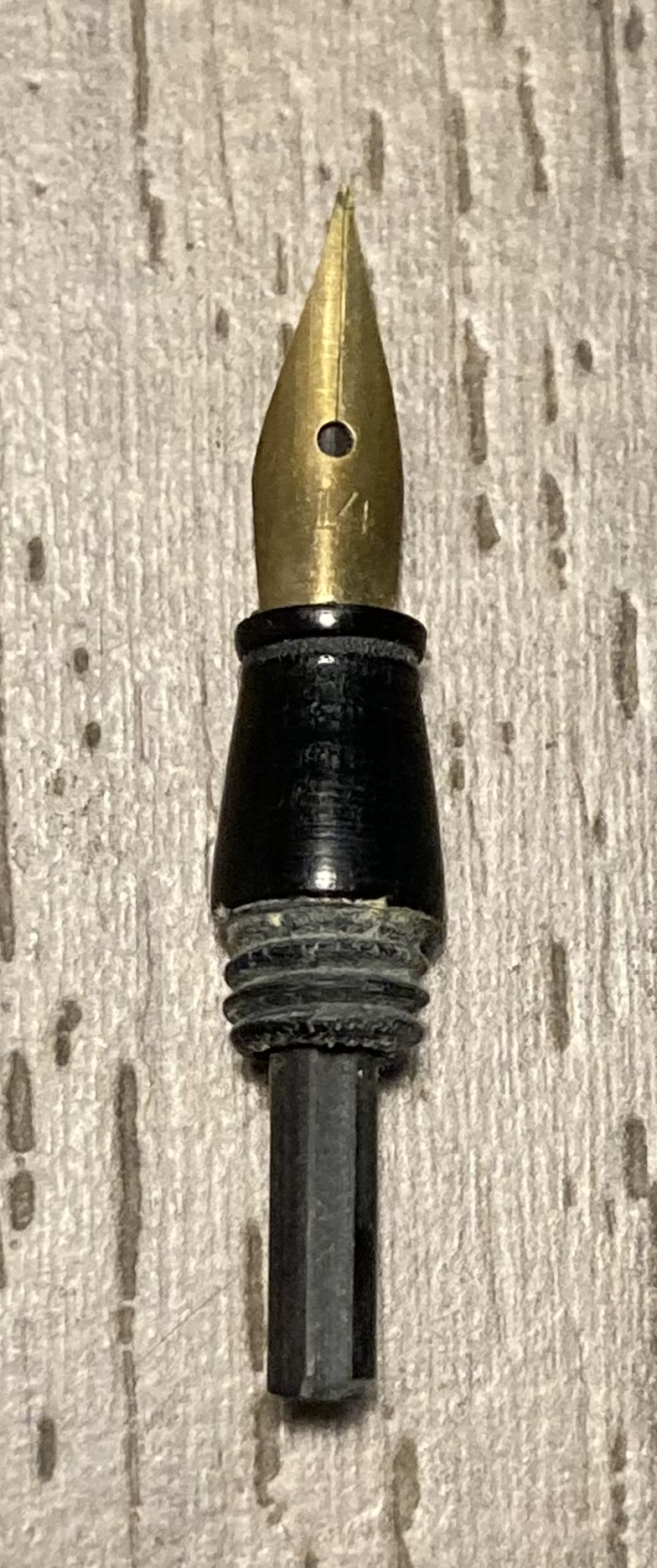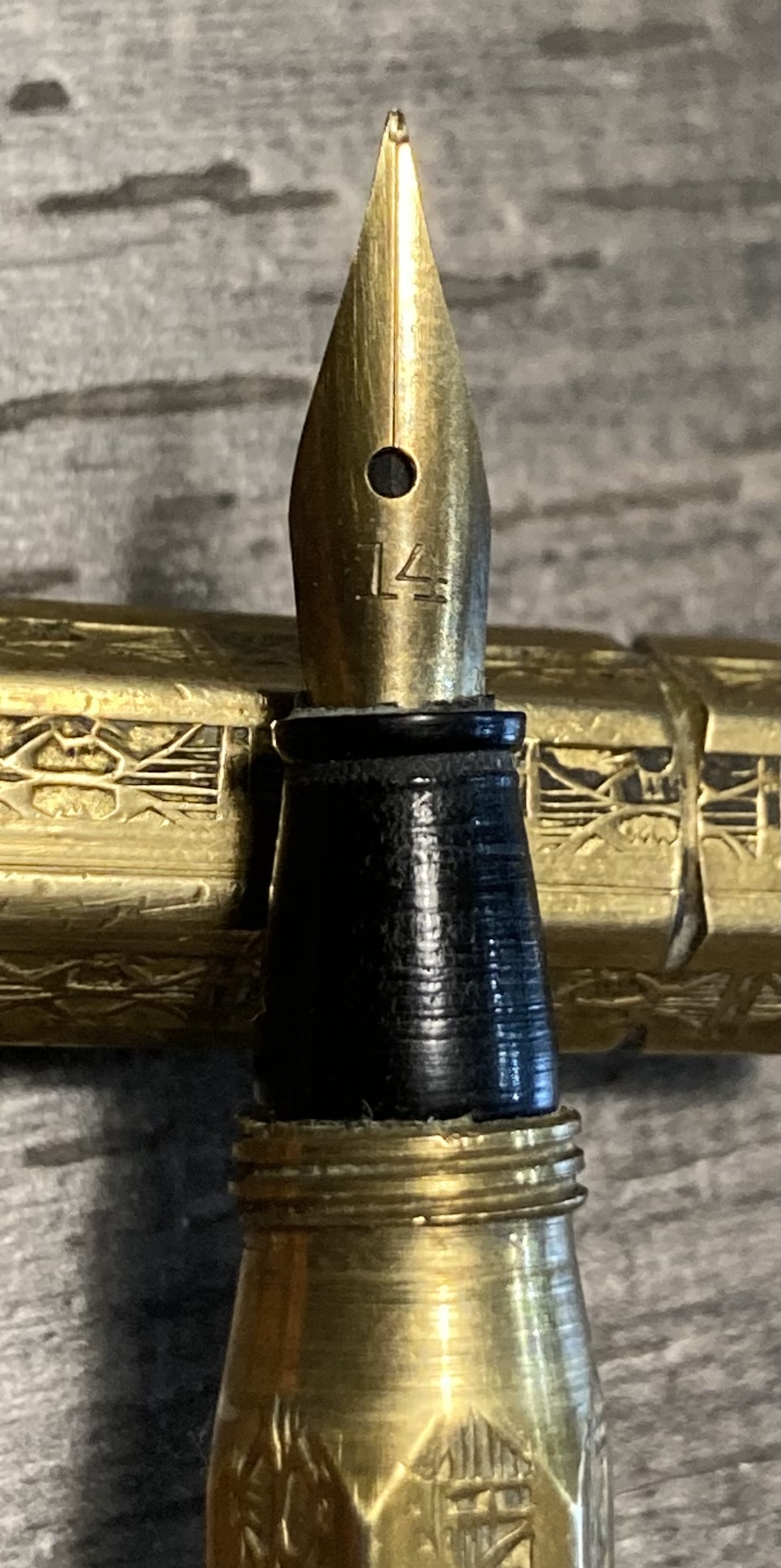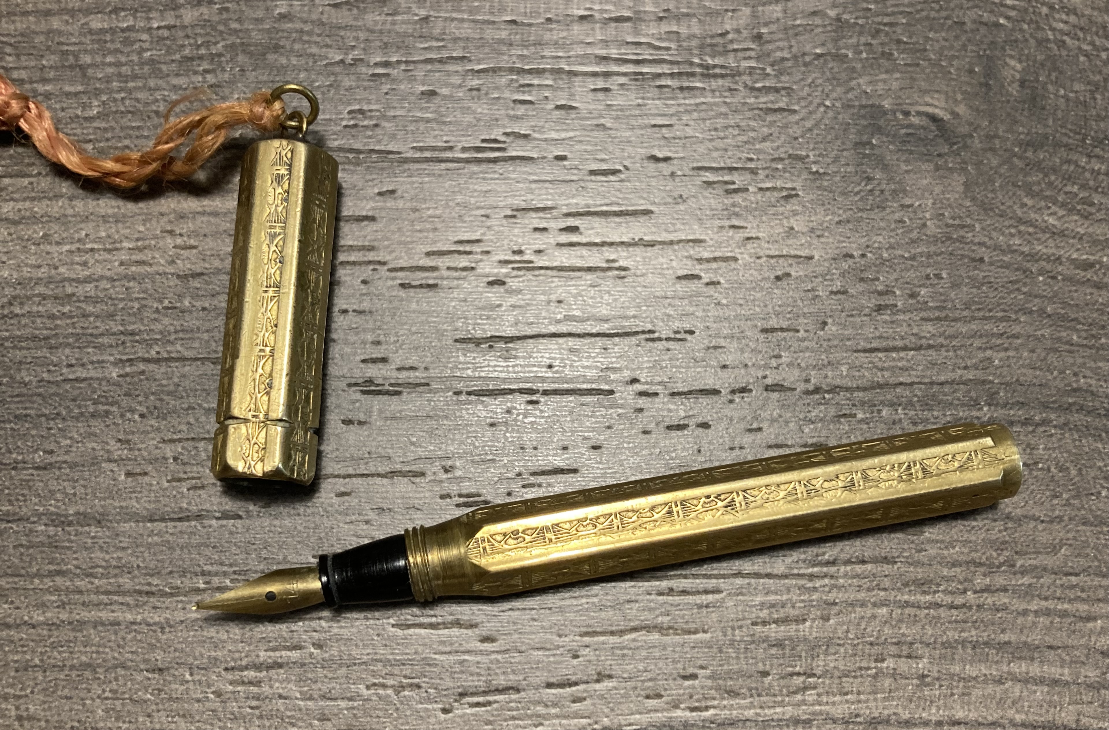 Mi sono portata a casa invece questa piccoletta di circa 10 cm in ottone, che credo sia da caricare con il contagocce o siringa direttamente nel fusto, dove l’alimentatore si inserisce a vite. Il pennino dice solo “14”, che non so se intenda una vecchia misura o l’oro. Sembra in buono stato ed è un po’ flessibile (ho provato piano piano per vedere come reagiva). L’incisione su fusto e cappuccio ricorda un disegno geometrico o un geroglifico ripetuto! Sapete indirizzarmi su cosa mi sono portata a casa?