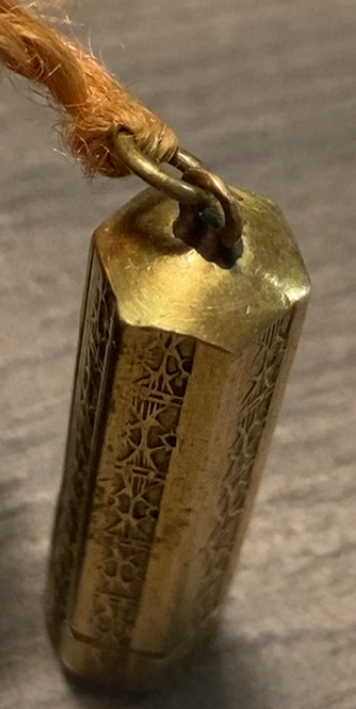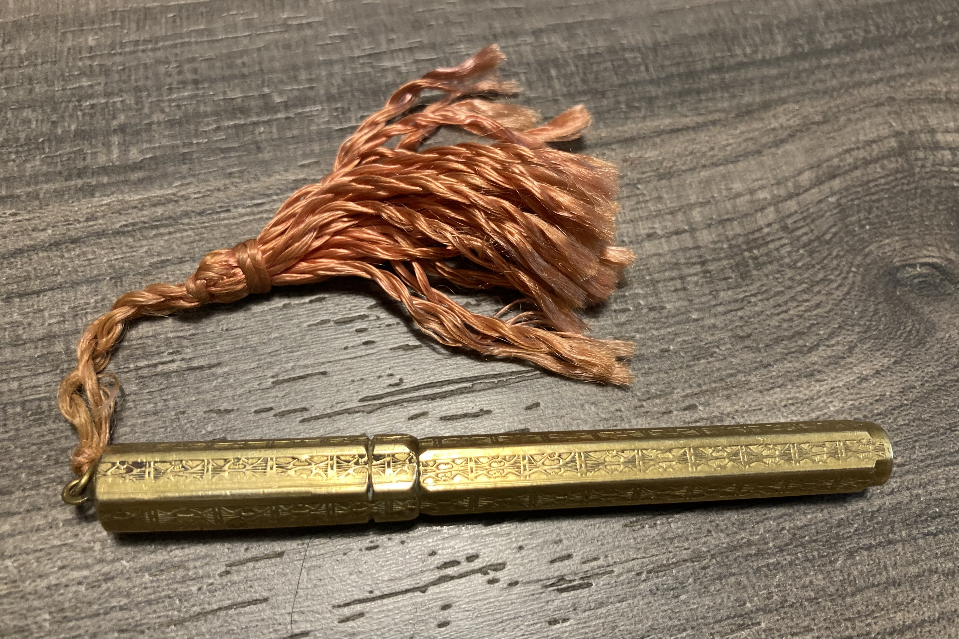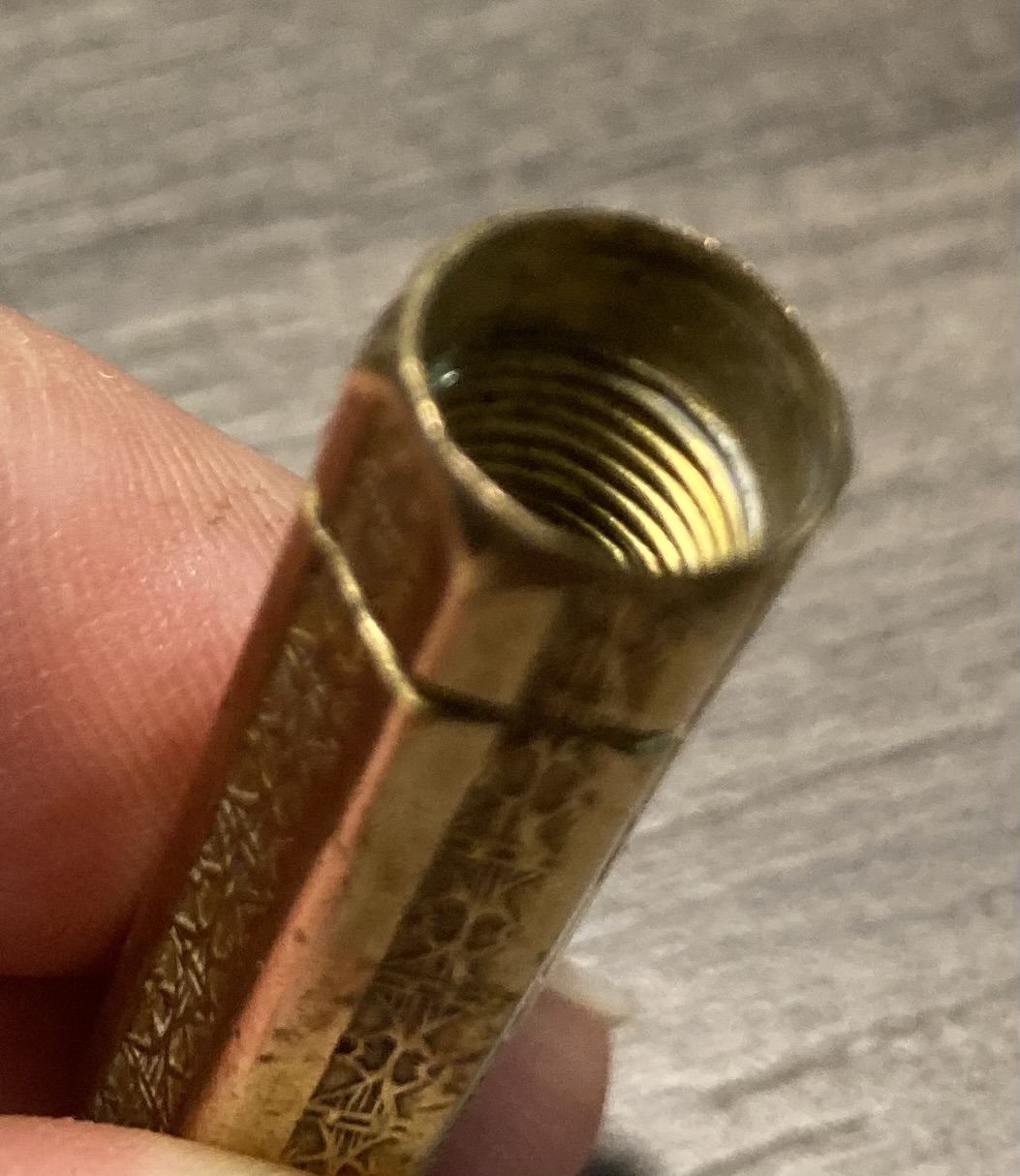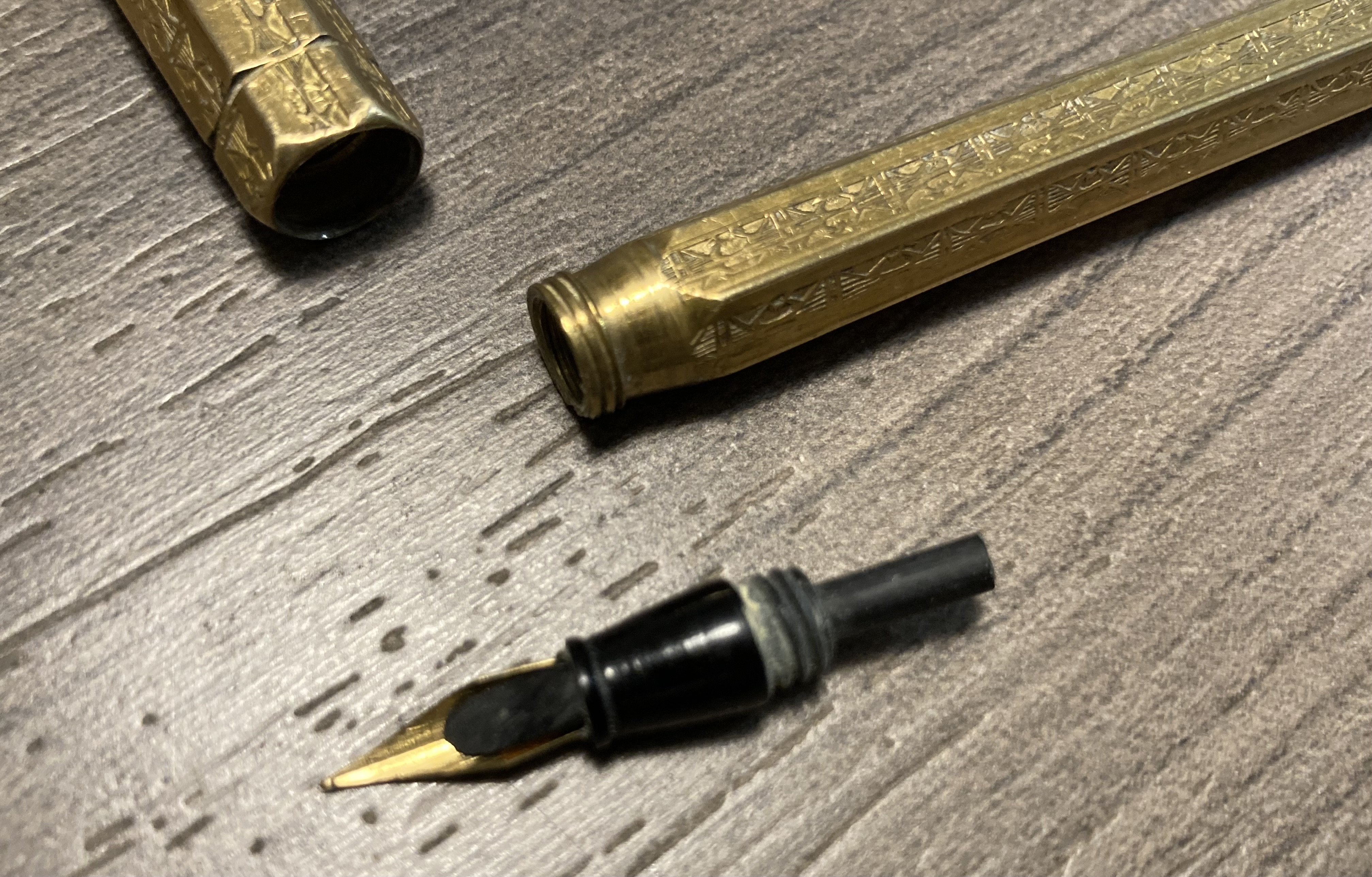 Mi sono portata a casa invece questa piccoletta di circa 10 cm in ottone, che credo sia da caricare con il contagocce o siringa direttamente nel fusto, dove l’alimentatore si inserisce a vite. Il pennino dice solo “14”, che non so se intenda una vecchia misura o l’oro. Sembra in buono stato ed è un po’ flessibile (ho provato piano piano per vedere come reagiva). L’incisione su fusto e cappuccio ricorda un disegno geometrico o un geroglifico ripetuto! Sapete indirizzarmi su cosa mi sono portata a casa?