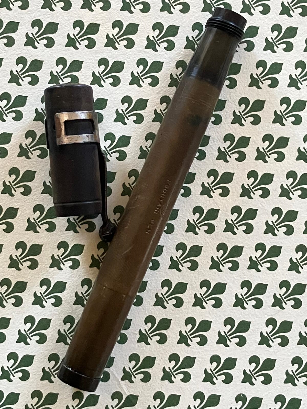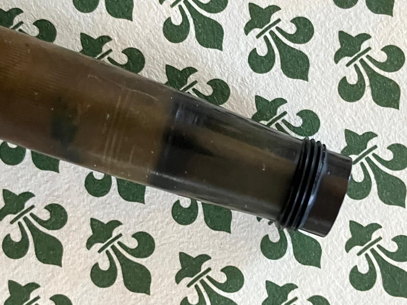 E' piccolina, ma non poi tanto (pressoché come una Pelikan 101), è in ebanite, ed era "chased" solo che il motivo zigrinato a spina di pesce è quasi scomparso con l'uso. E' una rientrante, dicevo, e il pennino è marcato unicamente con Waterman's IDEAL, e qualcosa che non leggo più sotto.