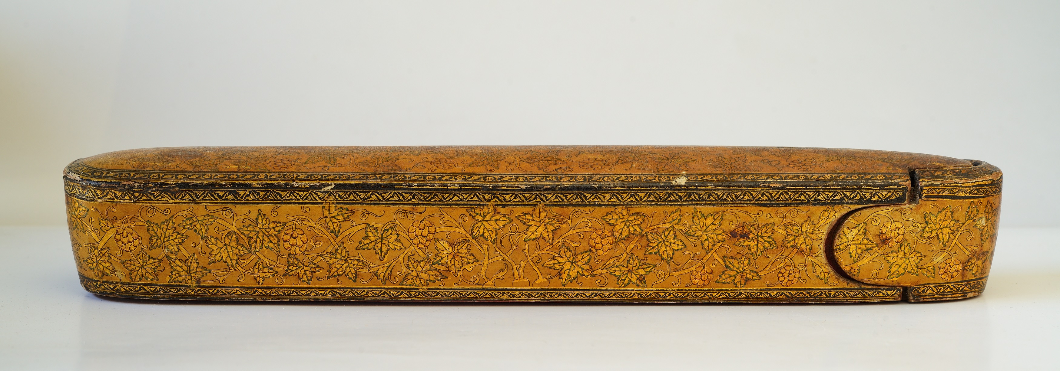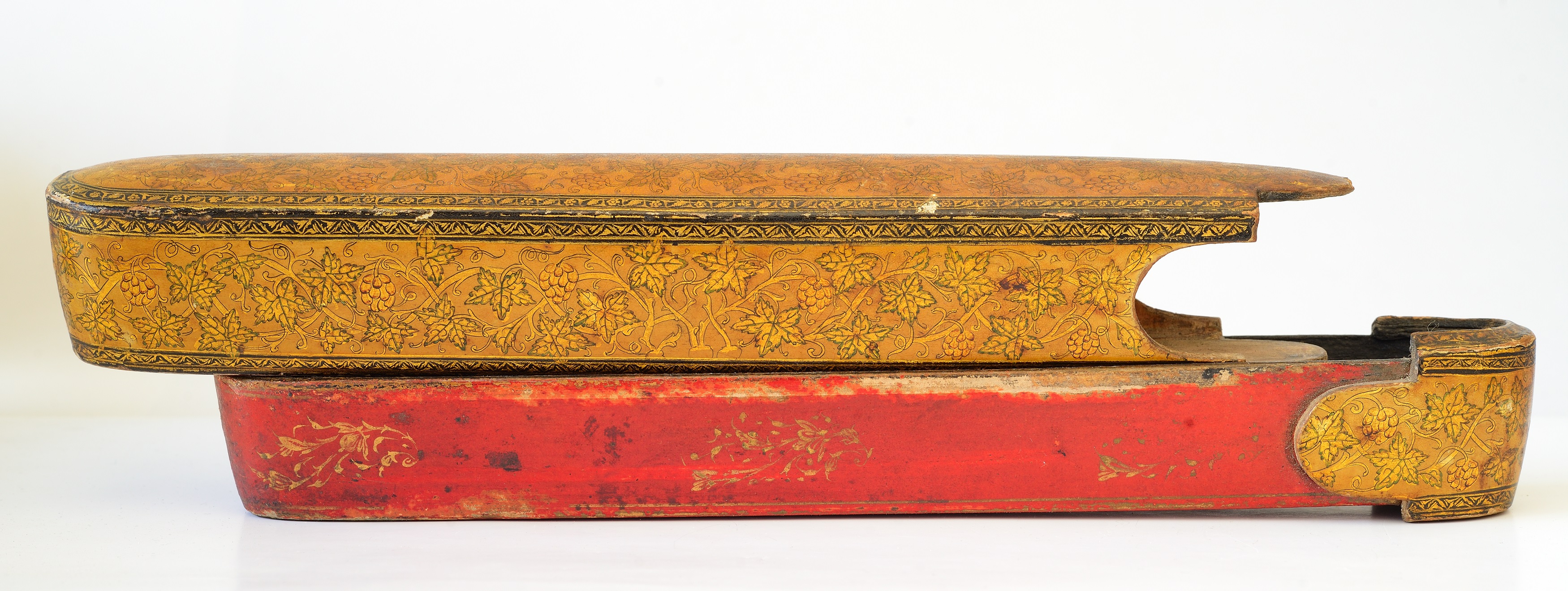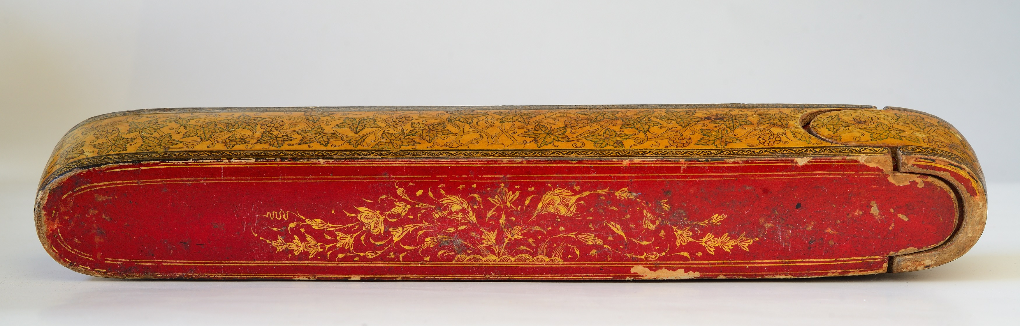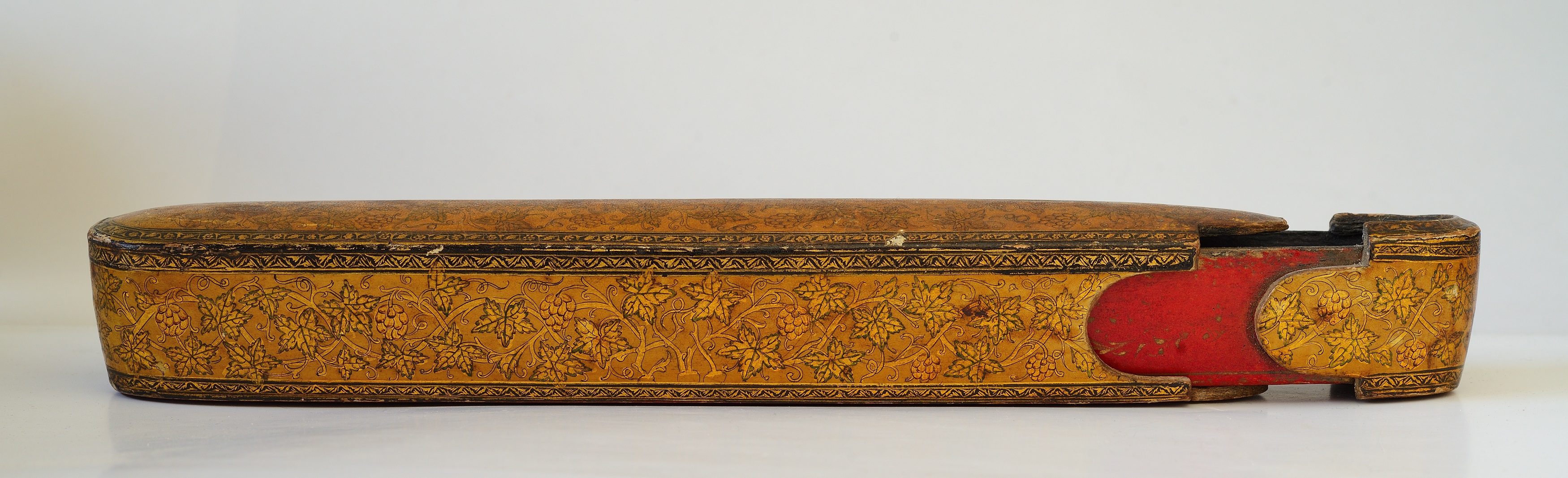 E' un astuccio portapenne ed accessori, in legno e cartapesta laccato e dipinto in oro, con motivi vegetali e floreali.