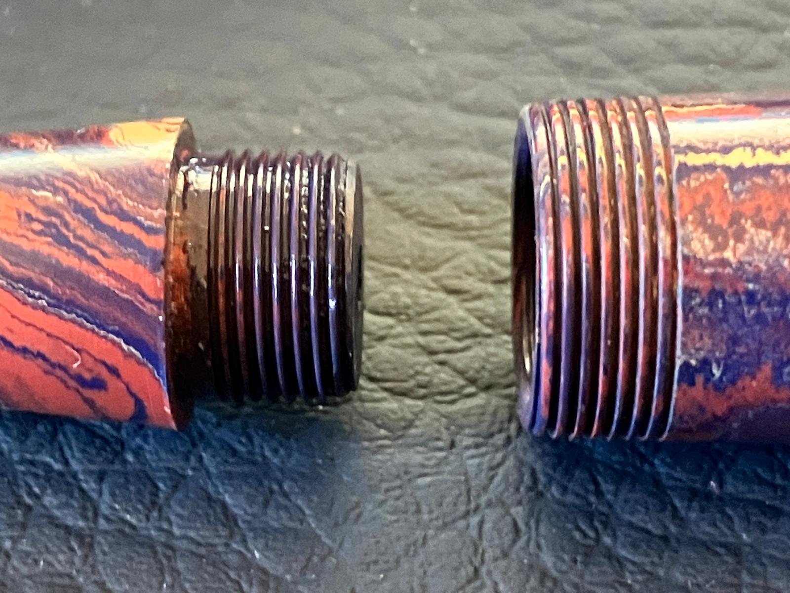 Lo spessore della ebanite che forma il fusto è notevole, non sono andato a misurarla con il calibro, ma ad occhio è sicuramente più di 1,5 mm, in corrispondenza della filettatura, all'interno forse è di più.