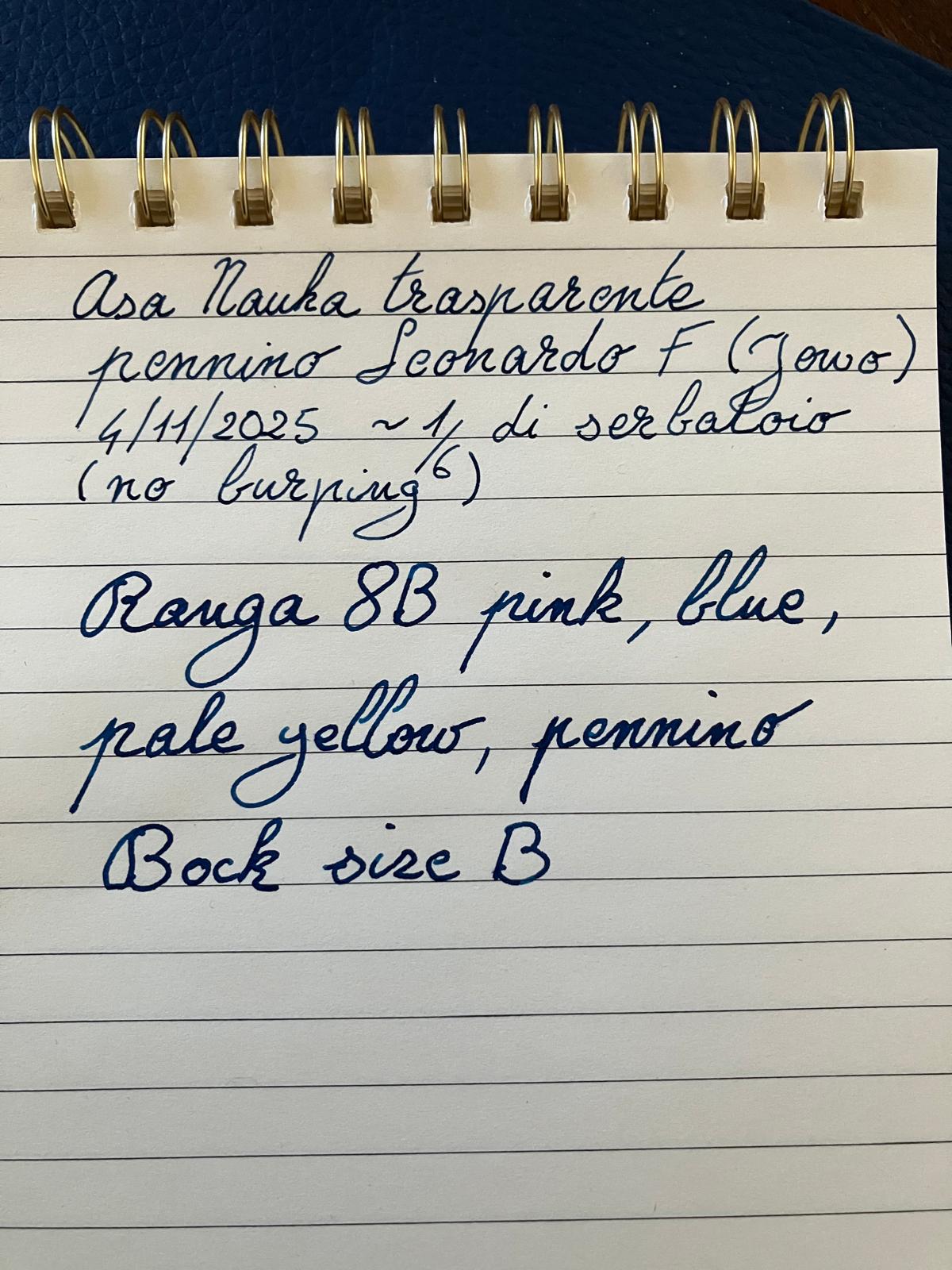 solo per aggiornamento, in questi giorni ho continuato ad usare la Asa Nauka, che è piena a circa 1/6 di serbatoio, ma di burping neanche l'ombra, anche tenendola in mano per un certo tempo. E' possibile che il primo evento sia stato causato da qualche mia manovra non avveduta, ad esempio non aver asciugato l'eccesso di inchiostro sul pennino dopo il primo caricamento...