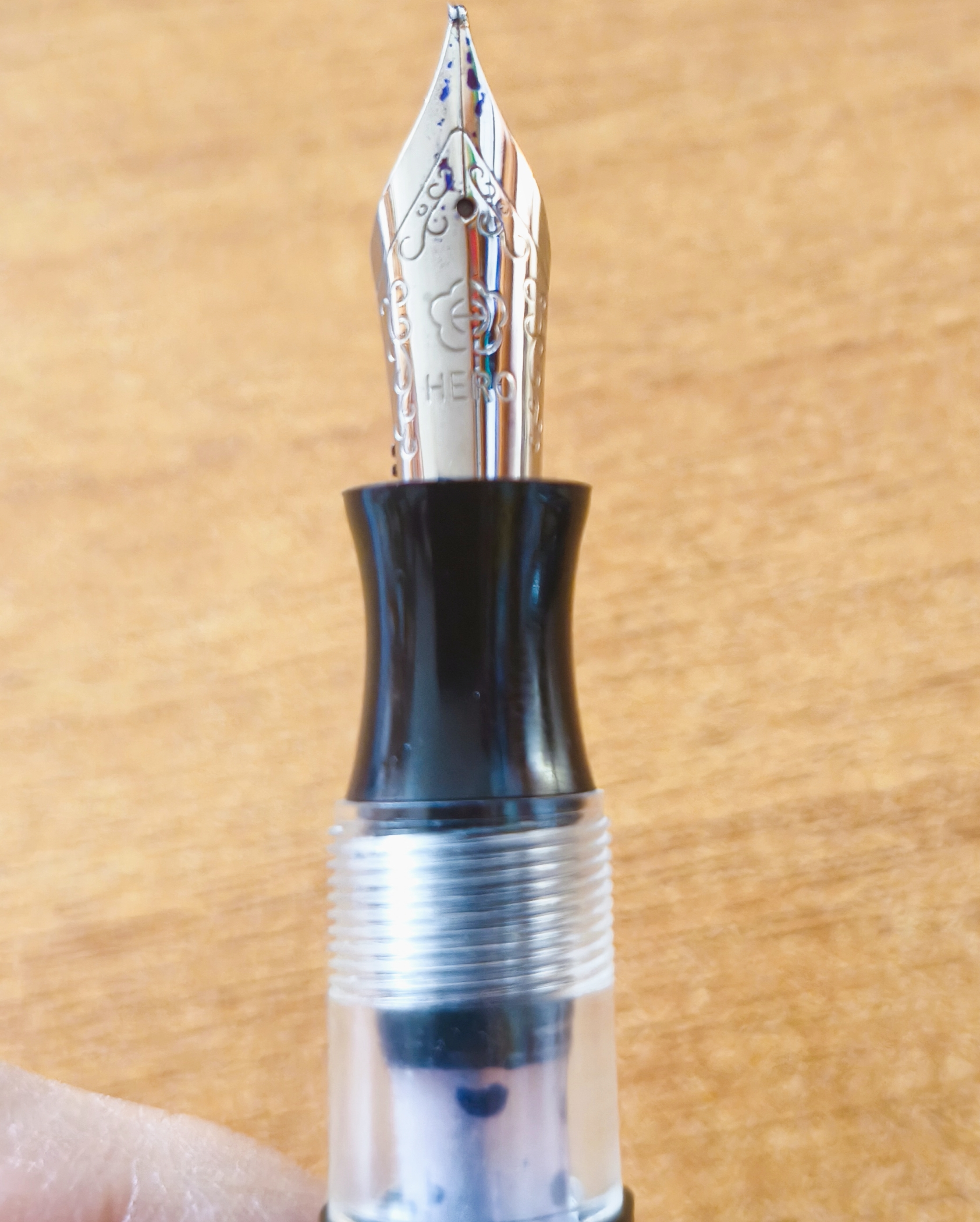 Caricamento aerometrico non particolarmente capacitativo (ci entrerebbero 2 ml di inchiostro ma se ne carico 1 ml, mi e già andata bene), pennino in acciaio da 0,5mm di una grandezza direi 6.