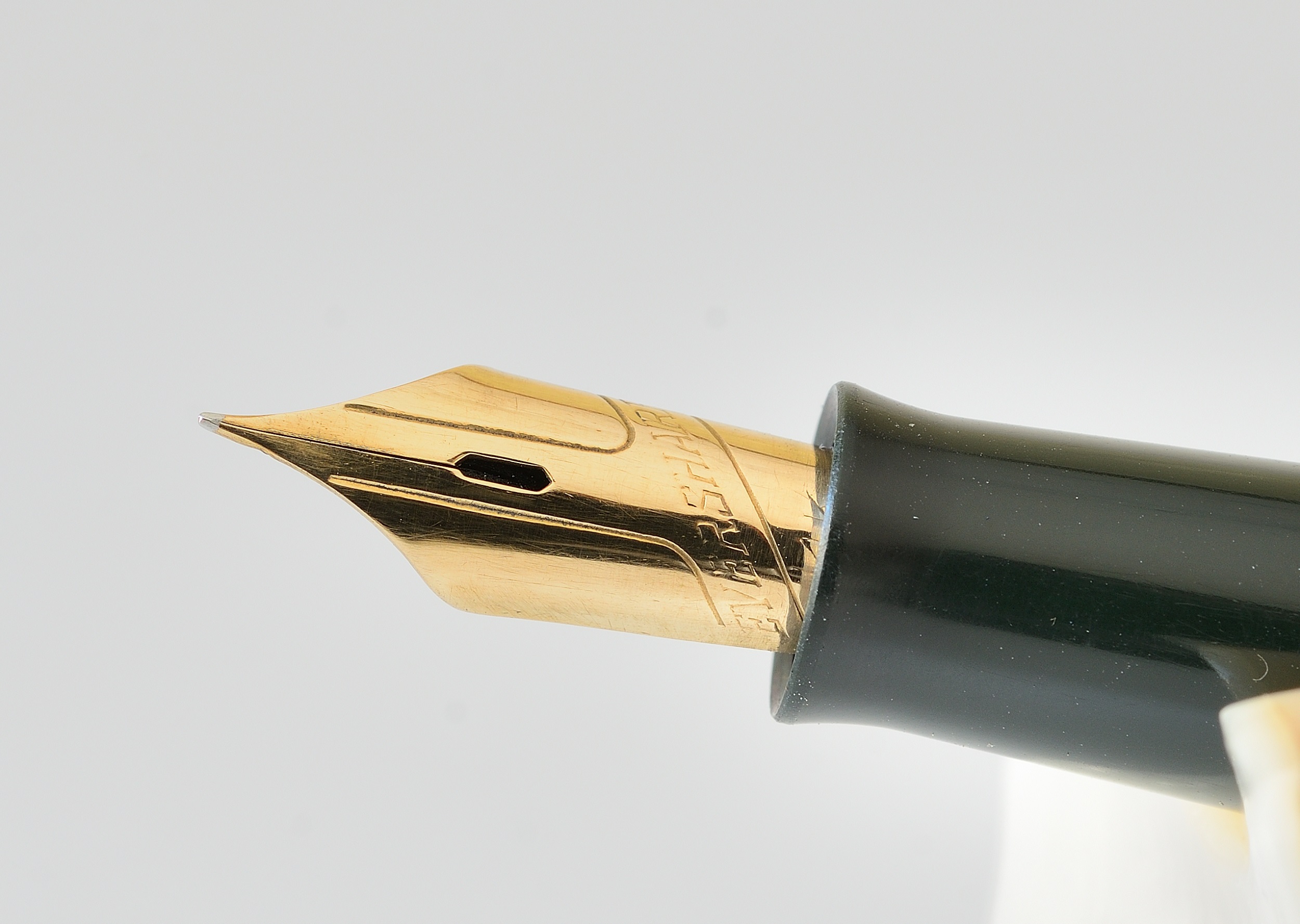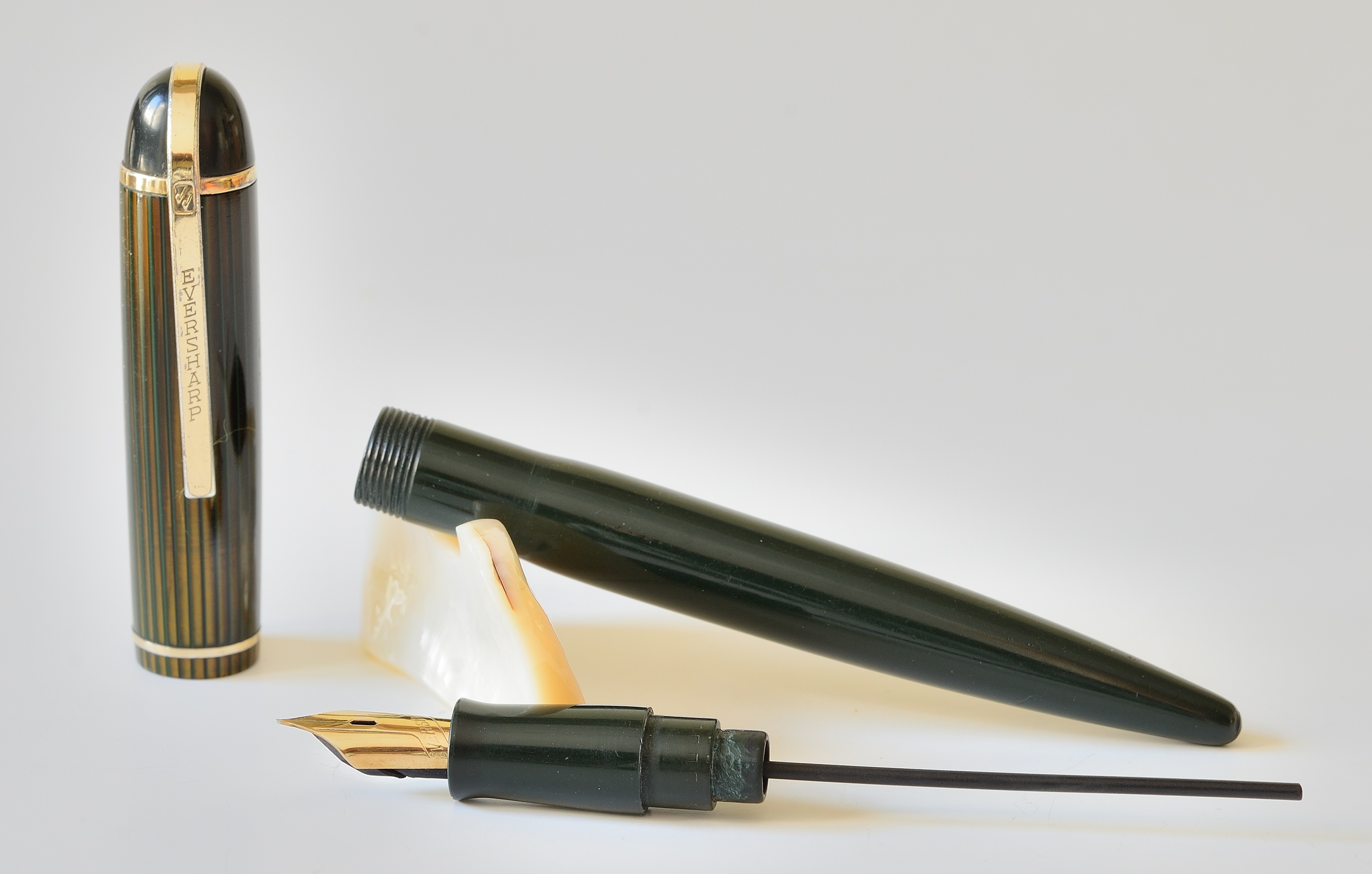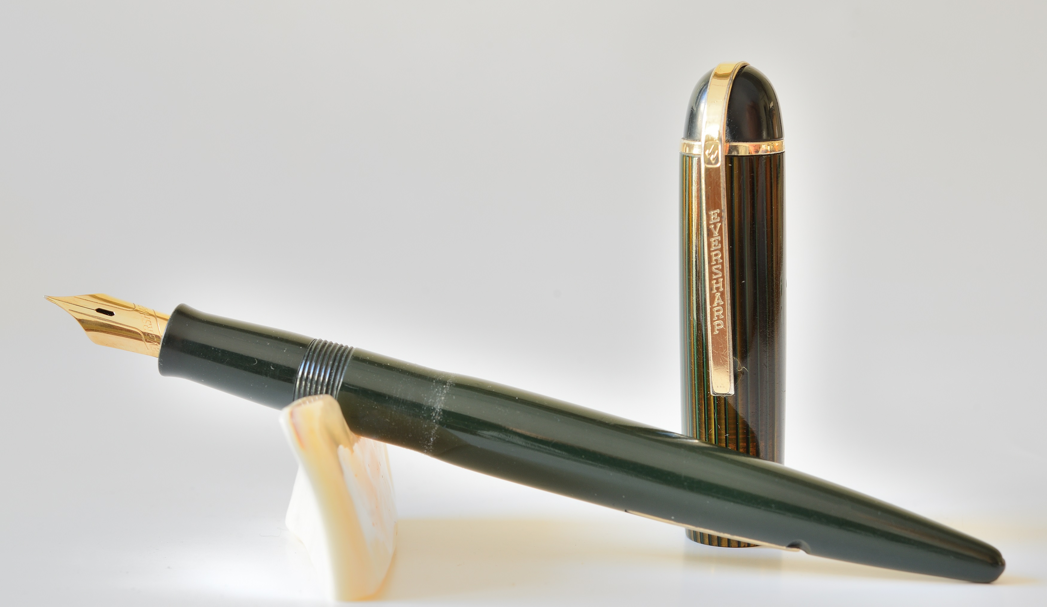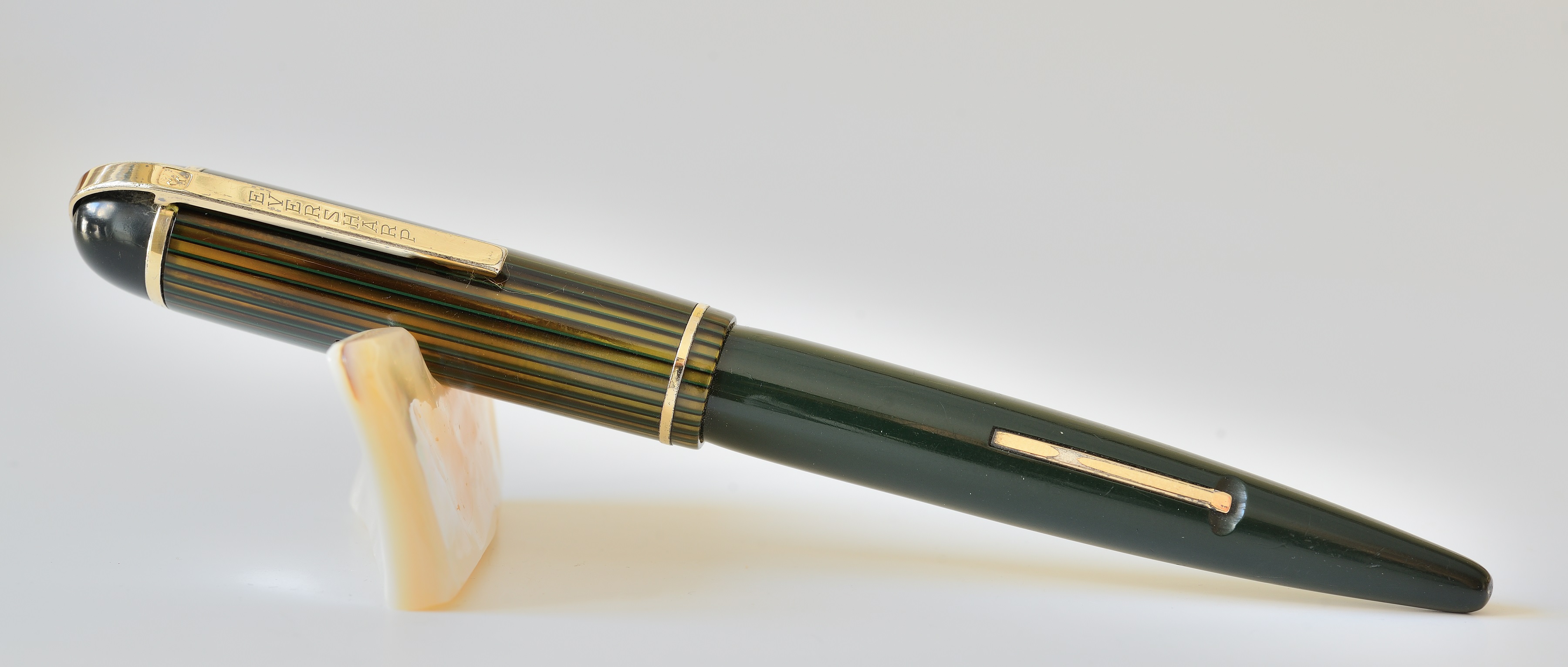 credo sia degli anni dell'entrata in guerra USA, clip ed anellino al cappuccio in argento dorato (vermeil), cappuccio in celluloide striata verde e oro, fusto verde scuro, pennino in oro 14K, un F rigido. Qui le immagini: