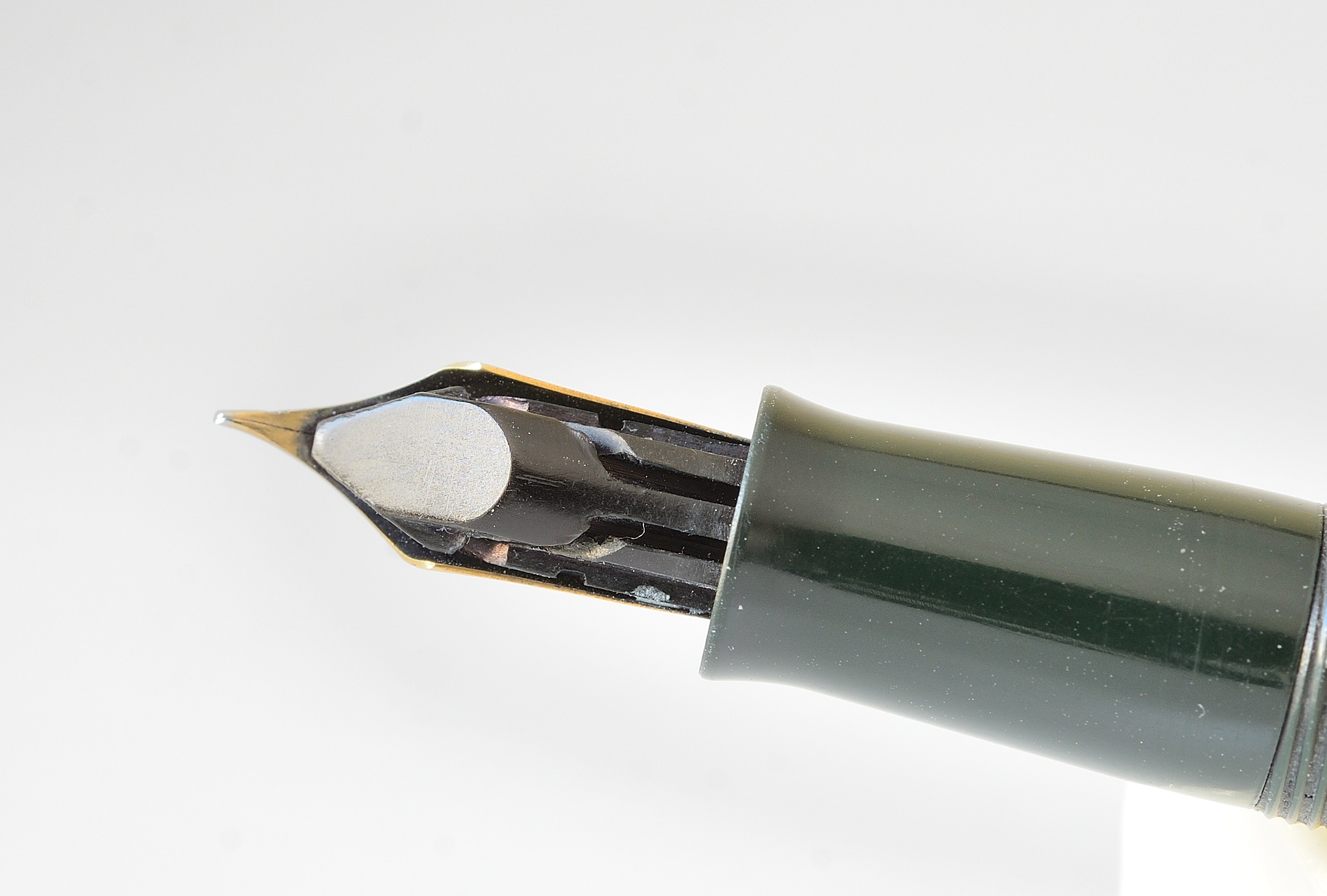 Altro bancarellaro, anche lui ha insistito tanto affinché la prendessi: una Eversharp Skyline praticamente nuova, manca solo il sacchetto interno, credo sia degli anni dell'entrata in guerra USA, clip ed anellino al cappuccio in argento dorato (vermeil), cappuccio in celluloide striata verde e oro, fusto verde scuro, pennino in oro 14K, un F rigido. [...]