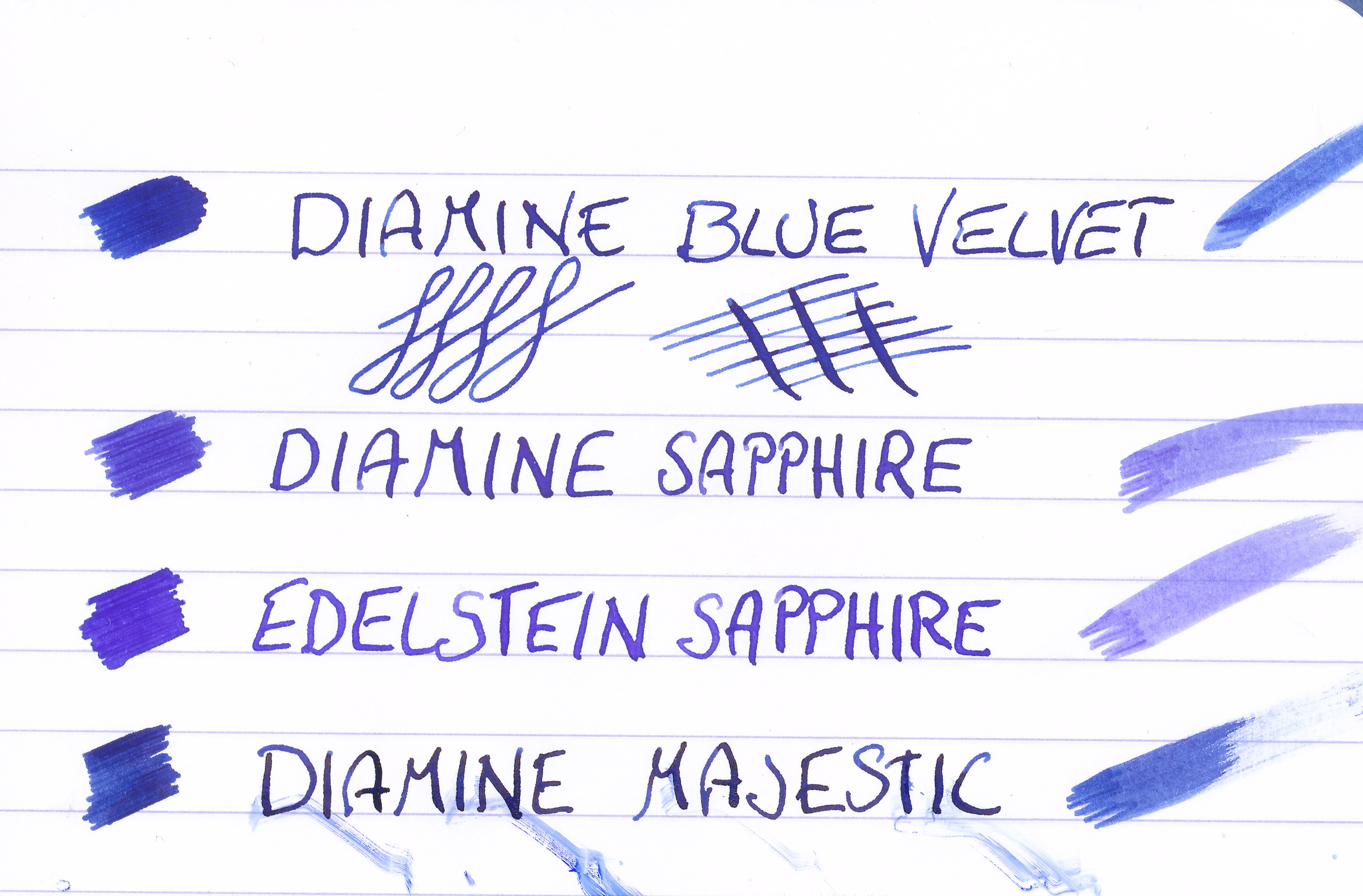 4 blu a confronto: Diamine Blue Velvet, Majestic Blue, Sapphire Blue e Pelikan Edelstain Sapphire Blue