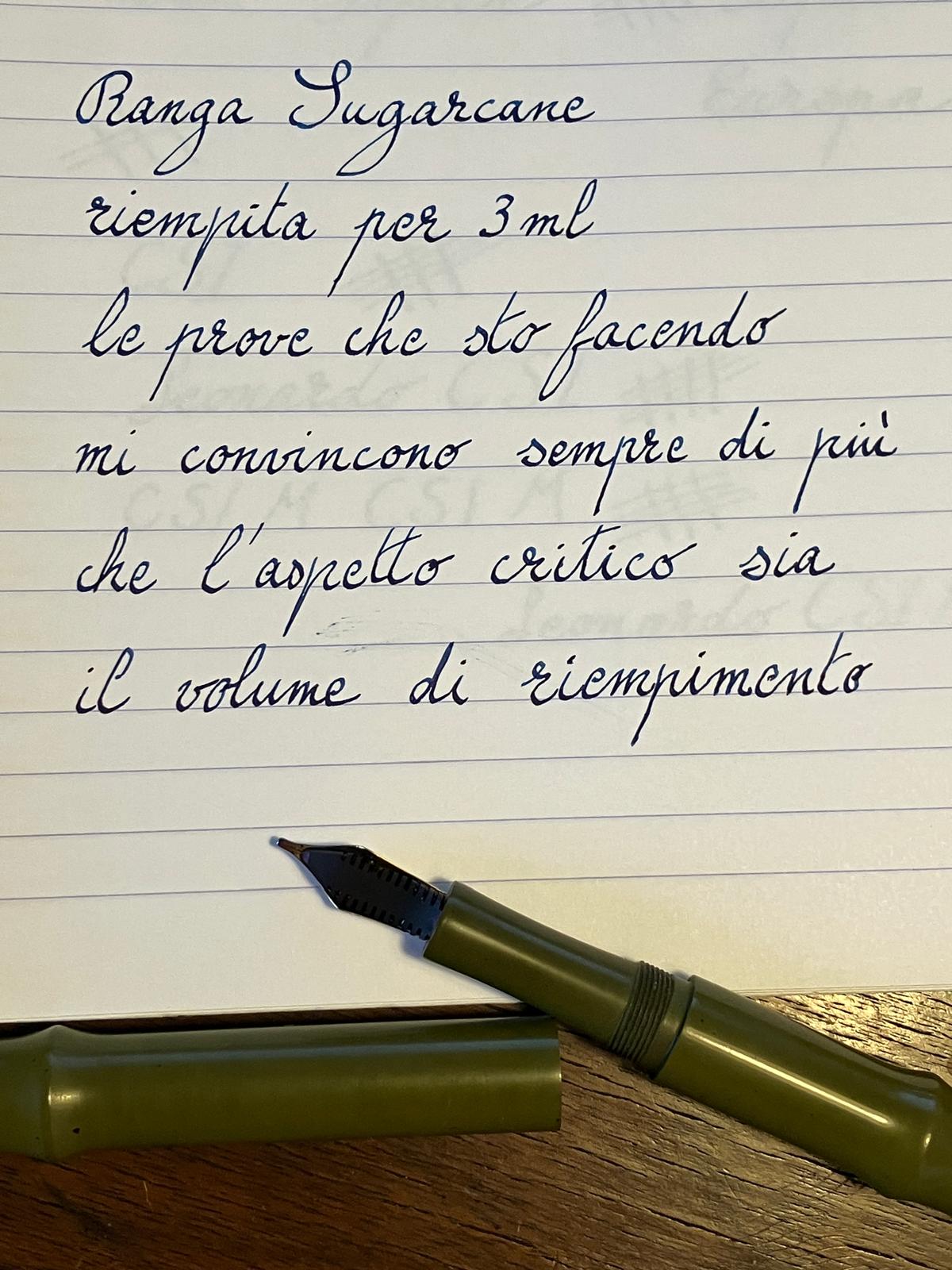 Stamattina, dopo una notte a riposo in orizzontale (20,5 gradi), la Ranga Sugarcane, malgrado il cambio di alimentatore con il Leonardo, non ha voluto, dopo un po' che la tengo in mano, ma davvero questione di minuti, comunque esimersi dal presentare la sua bella gocciolina pronta sotto il pennino... piccola, non copiosa, tuttavia c'era.