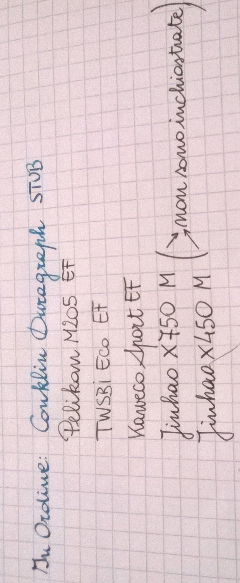 Esteticamente la Duragraph piace anche a me, sullo stub ho qualche riserva visto che prediligo i tratti EF/F giapponesi, ed EF europei (tralasciando i Pelikan che sono un caso a parte). La Italix non la conoscevo, per curiosità sono andato a cercarla sulla rete, ma i modelli che ho visto non mi hanno entusiasmato.MiataJPS ha scritto: la Conklin esteticamente al momento vince a mani basse su tutte le altre nominate e candidate. Mi piace tanto in versione verde (amo il verde) ma anche la tua risulta molto signorile. Il pennino forse è meno incisivo di quello che ho in mente, ma d'altronde io sto partendo, come riferimento, da un pennino calligrafico, immagino sia inevitabile che lo stub di una penna sia più morbido. In questo senso sicuramente dovrei preferirle al Italix. Però dopo qualche cinesata, ho voglia di una penna che non solo scriva bene ma che sia davvero piacevole anche allo sguardo