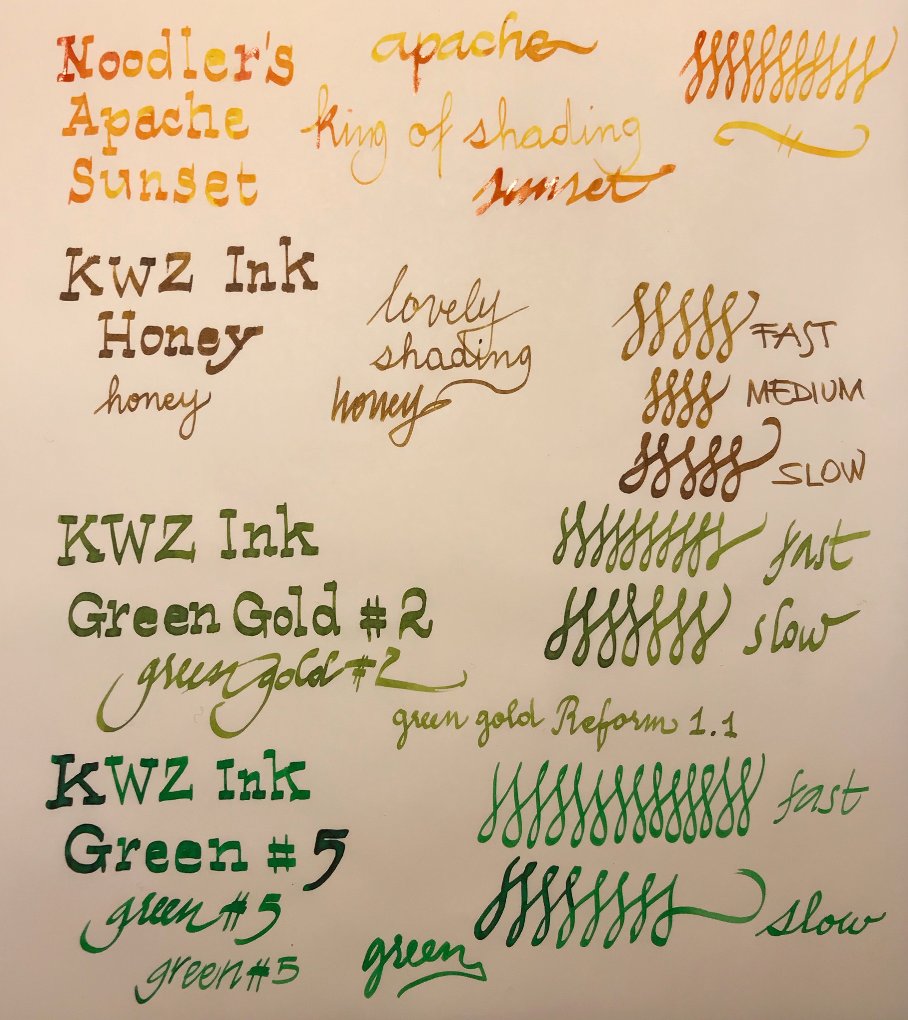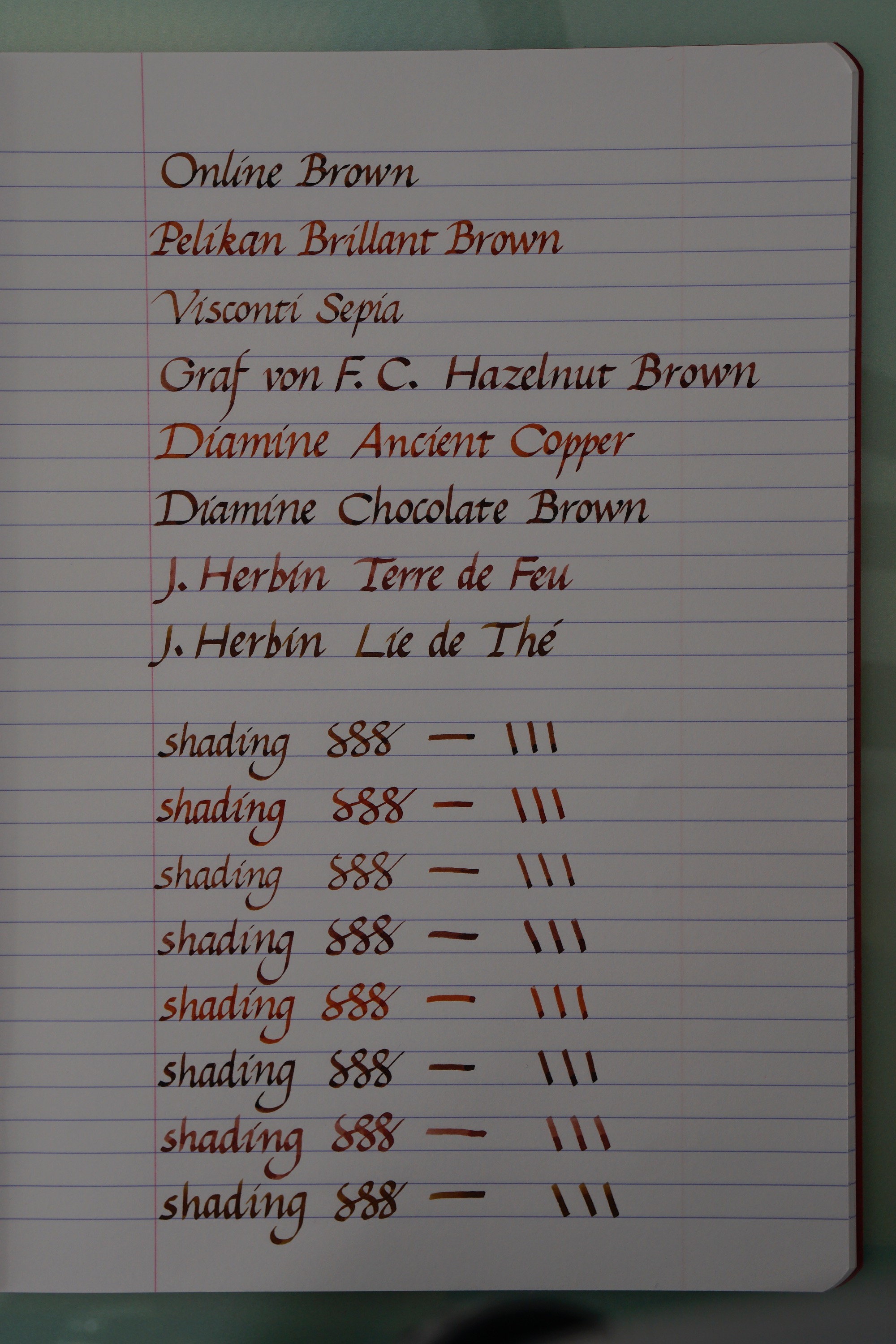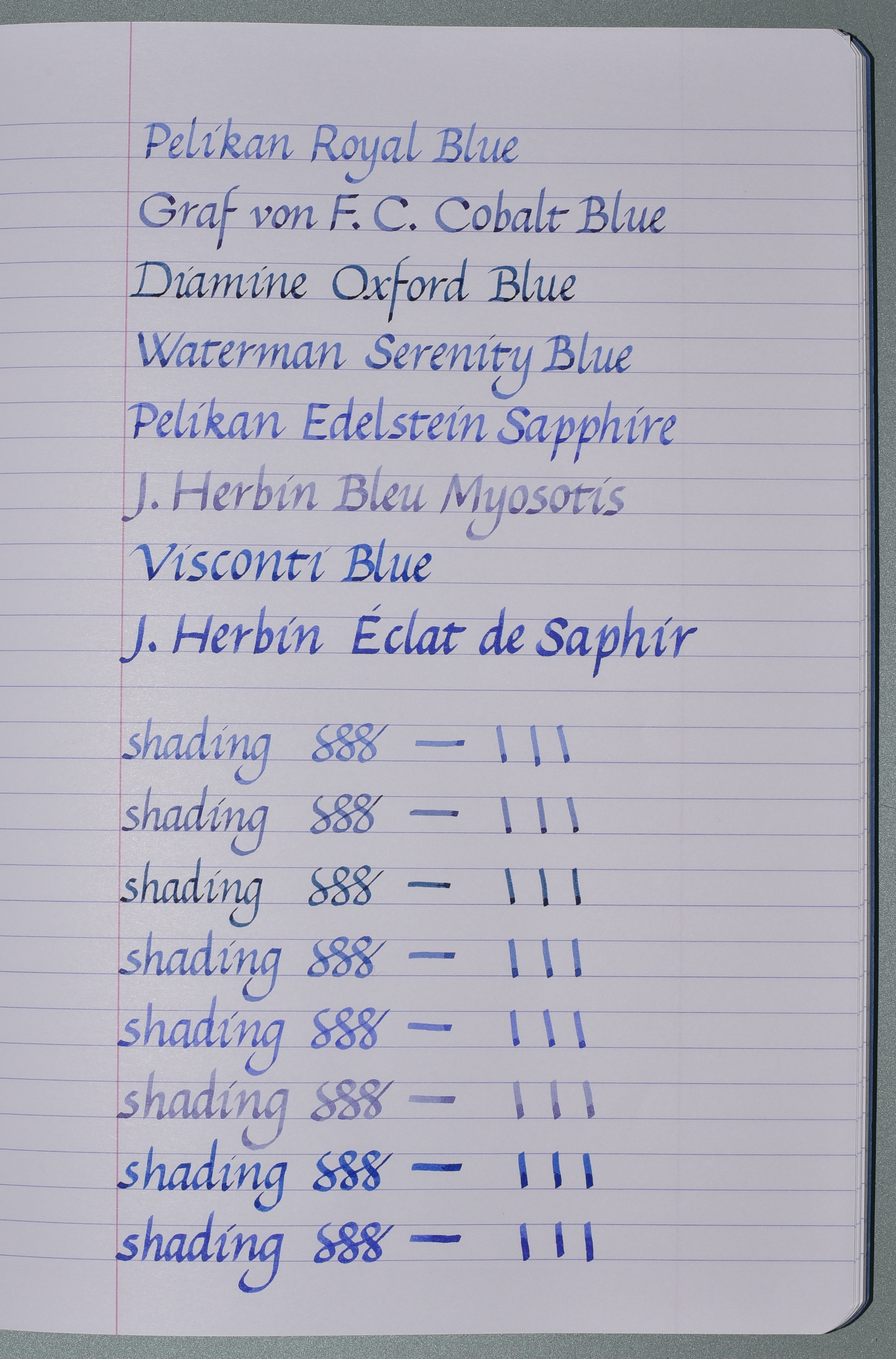 Come sempre cerco di mostrarveli tutti così potrete valutarli voi stessi; questo comporta però il mancato rispetto dei cinque gradi calligrafici che dovrei applicare. Ho aggiunto anche una pagina in cui mi sono divertita a vedere come cambia lo shading usando pennini di diversa misura (il pennino Lamy M è quello nero). La carta usata è sempre la Clairefontaine 90g.