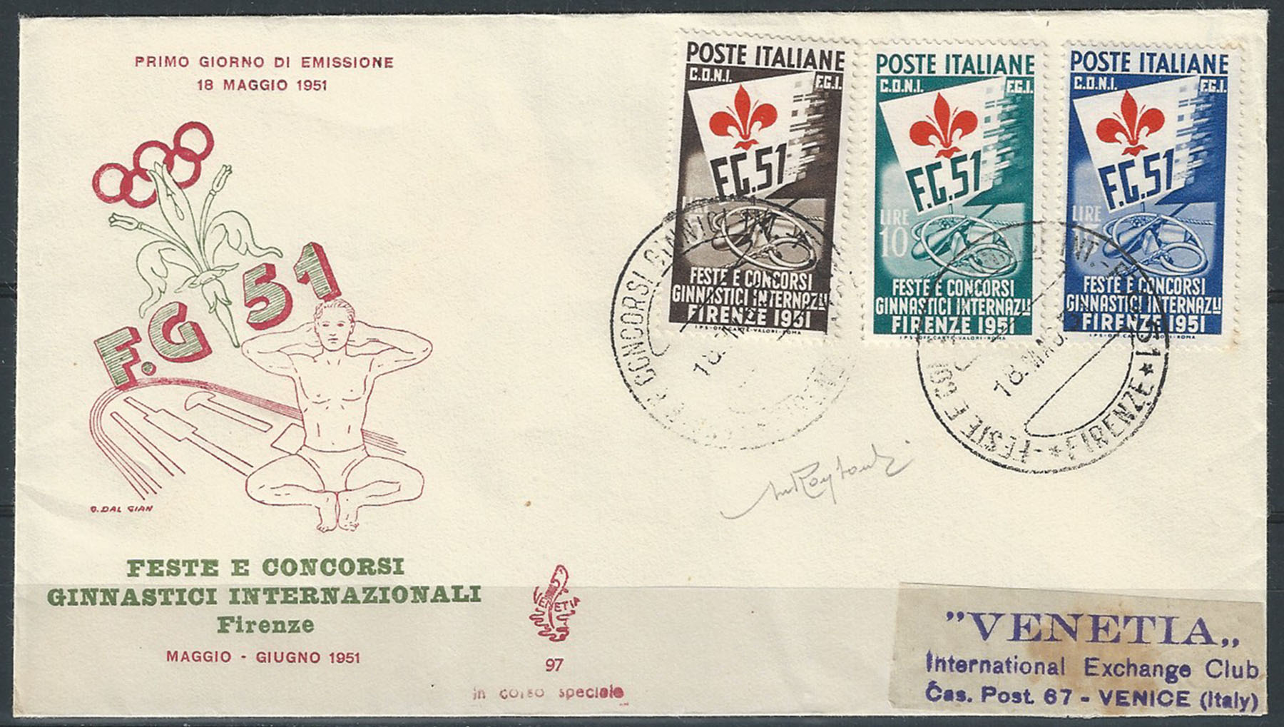 Qui sotto una busta Venetia relativa alla emissione “Feste e Concorsi ginnici internazionali” del 1951, di particolare pregio collezionistico e valore venale.