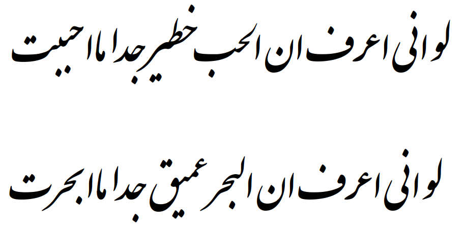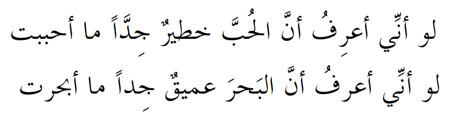 ti invio queste due foto di due versi tratti dalla Lettera da sott'acqua Di Nizar Qabbani https://it.wikipedia.org/wiki/Nizar_Qabbani. Gli stessi due versi sono ripetuti in due stili diversi. Dicono: