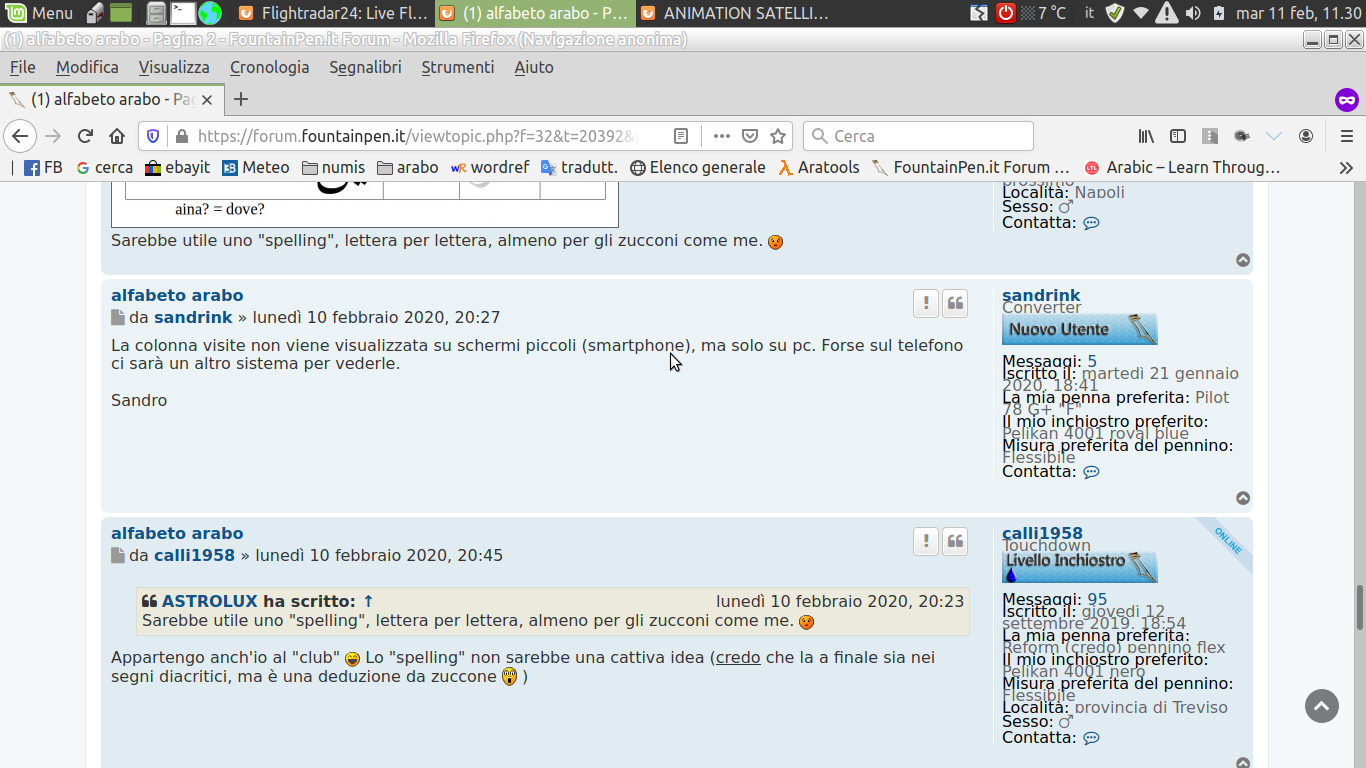 Grazie per l'interesse! Non mi sembra di aver notato differenze tra destrorsi e mancini nella scrittura degli arabi; devo dire però che tra loro non sono molti i mancini, forse anche per la distinzione tradizionale tra funzioni della destra e della sinistra (si mangia solo con la destra). Metto qualche parola di esempio per ogni lettera ma se vuoi scrivere una frase potresti provare con quella ripetuta in diversi stili nella foto introduttiva che, traslitterata in caratteri latini si scrive bismillàh al rahmàni al rahìm, che significa nel nome di Dio clemente e misericordioso. Se preferisci qualcosa di profanocalli1958 ha scritto: ↑lunedì 10 febbraio 2020, 11:21Mi associo a tutti quelli che non danno importanza al feedback, ma alle visualizzazioni. Con l'occasione però ti chiedo di soddisfare una mia curiosità (se puoi): il verso di scrittura è da dx verso sx, quindi dovrebbe essere più agevole per i mancini; guardando le lettere/parole che hai postato i tratti sembrano più consoni ai destrorsi; è così o interpreto male? oppure dipende dallo stile di scrittura utilizzato (cioè alcuni più adatti a i destri latri ai mancini)?