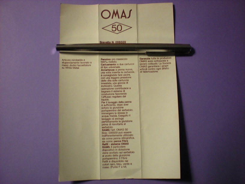 La foto si riferisce alla Omas del cinquantenario,edizione speciale, ha lo stesso pennino della Rinascimento, molto flessibile. La punta rivolta verso l'alto permette di scrivere con il pennino girato per ottenere un tratto più sottile. Da notare la "pallina" di iridio che è contraria a quella di un pennino normale.