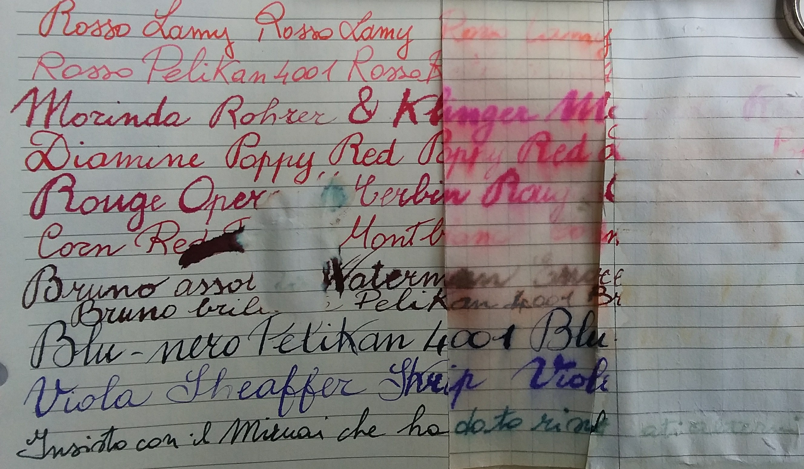 A sparire già con l'acqua BLU AURORA, ROSSO PELIKAN4001. A restare imperturbabile o quasi all'acqua il Blu nero PELIKAN4001, BLU NERO TWSBI , La REINE MAUVE e SEI BOKU. Imperturbabile ad acqua e candeggina SAILOR KIWA GURO..