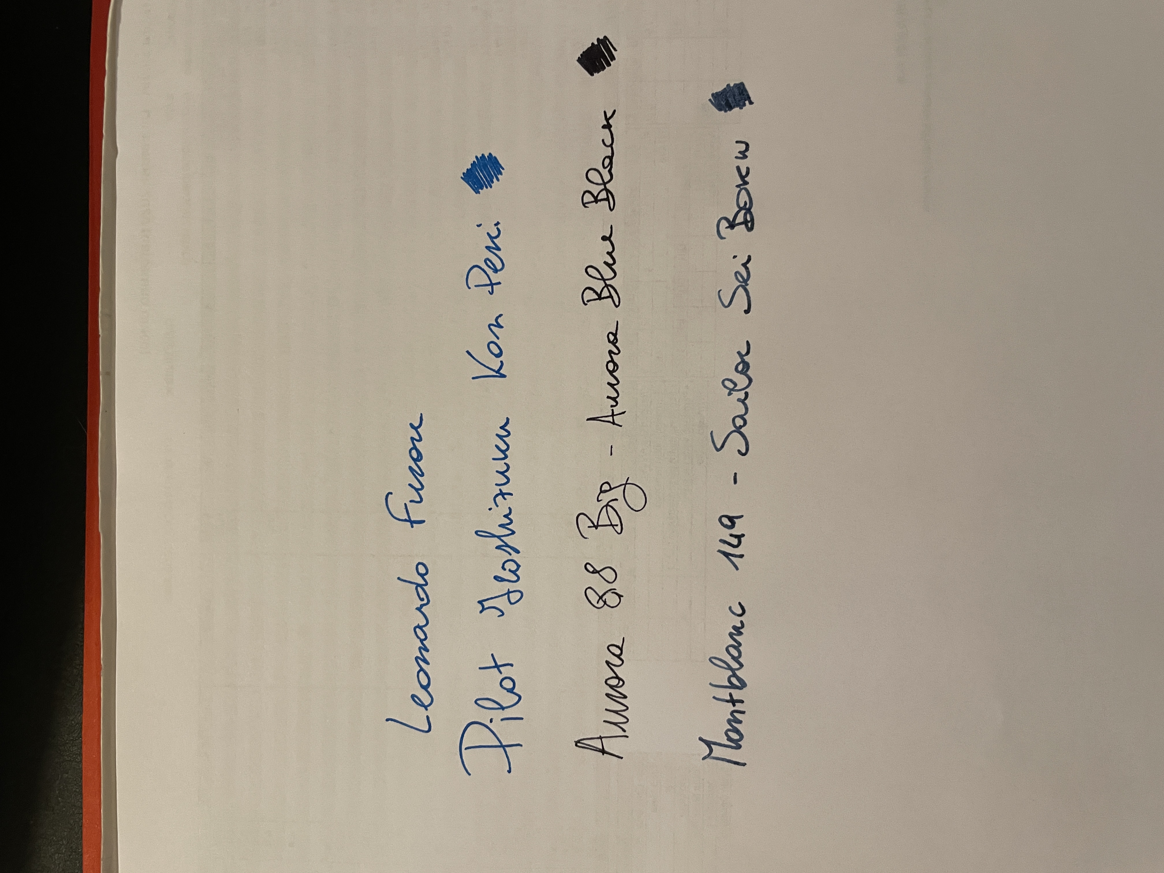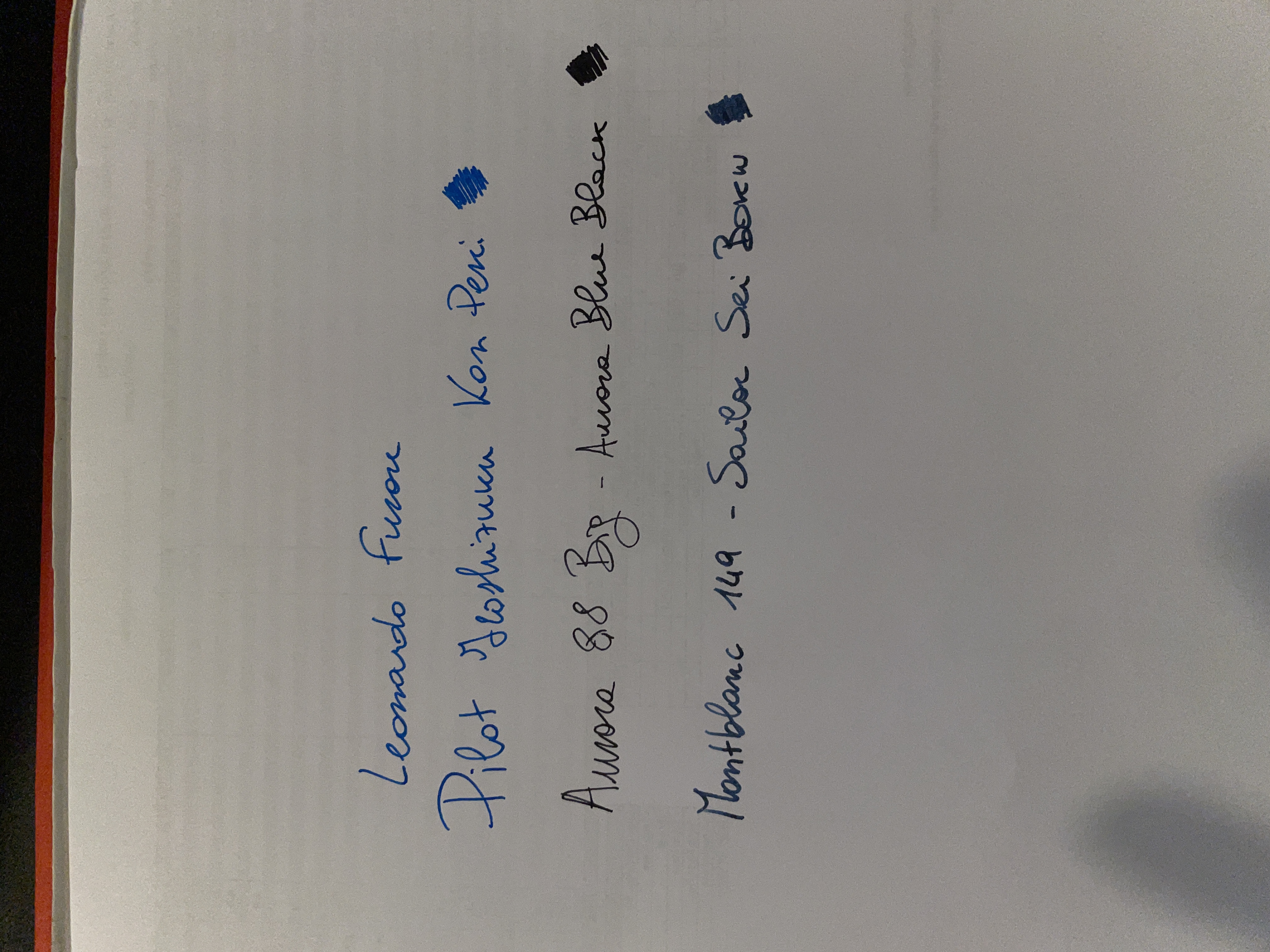 Ho scritto al volo due righe con il Pilot Iroshizuku Kon Peki (che è un vero azzurro), con il Blue black Aurora (penna ferma da una settimana, forse più scuro del suo solito) e con il Sailor Sei Boku ;)