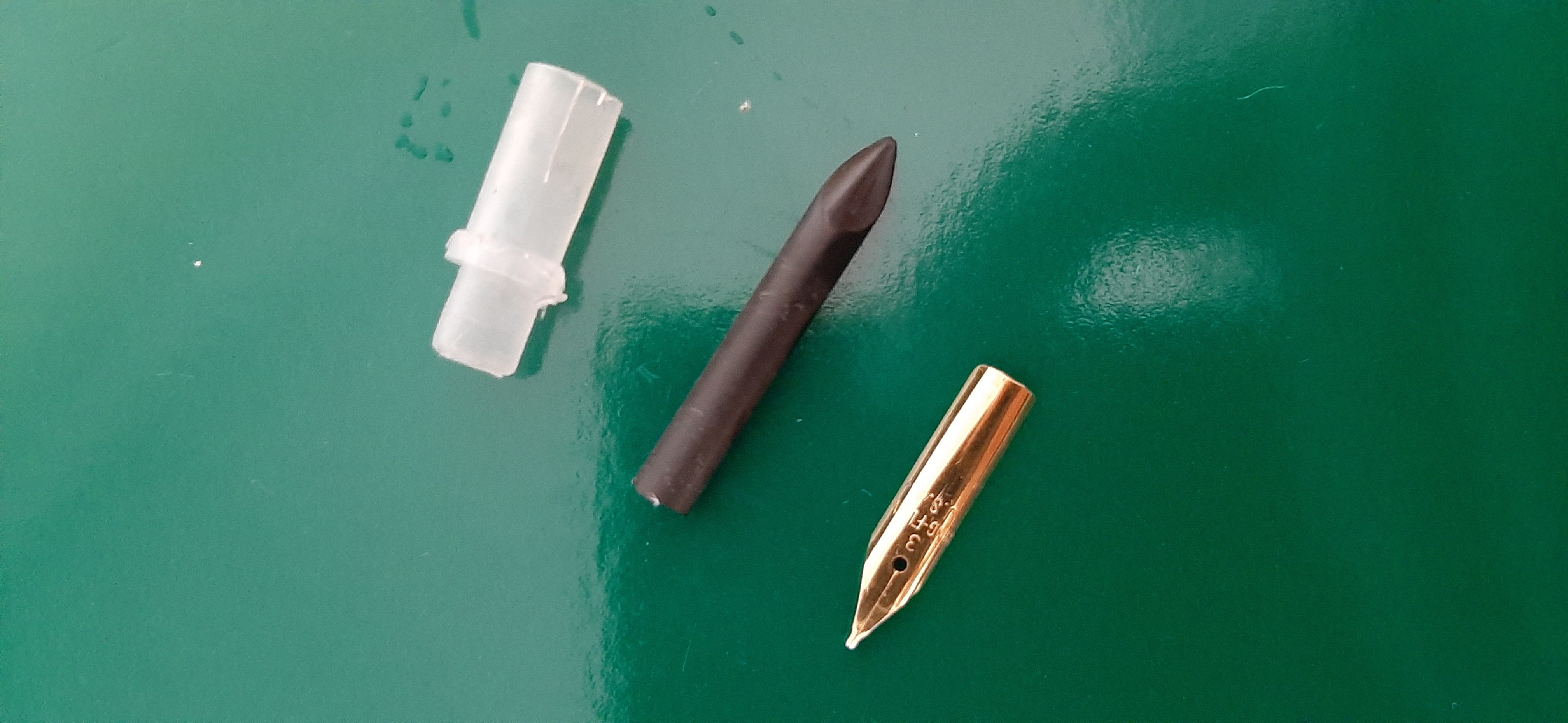 Il gruppo pennino/alimentatore/collarino è quello in plastica semitrasparente, che si innesta sul converter semplicemente a pressione. Poi sopra si avvita la corazza.