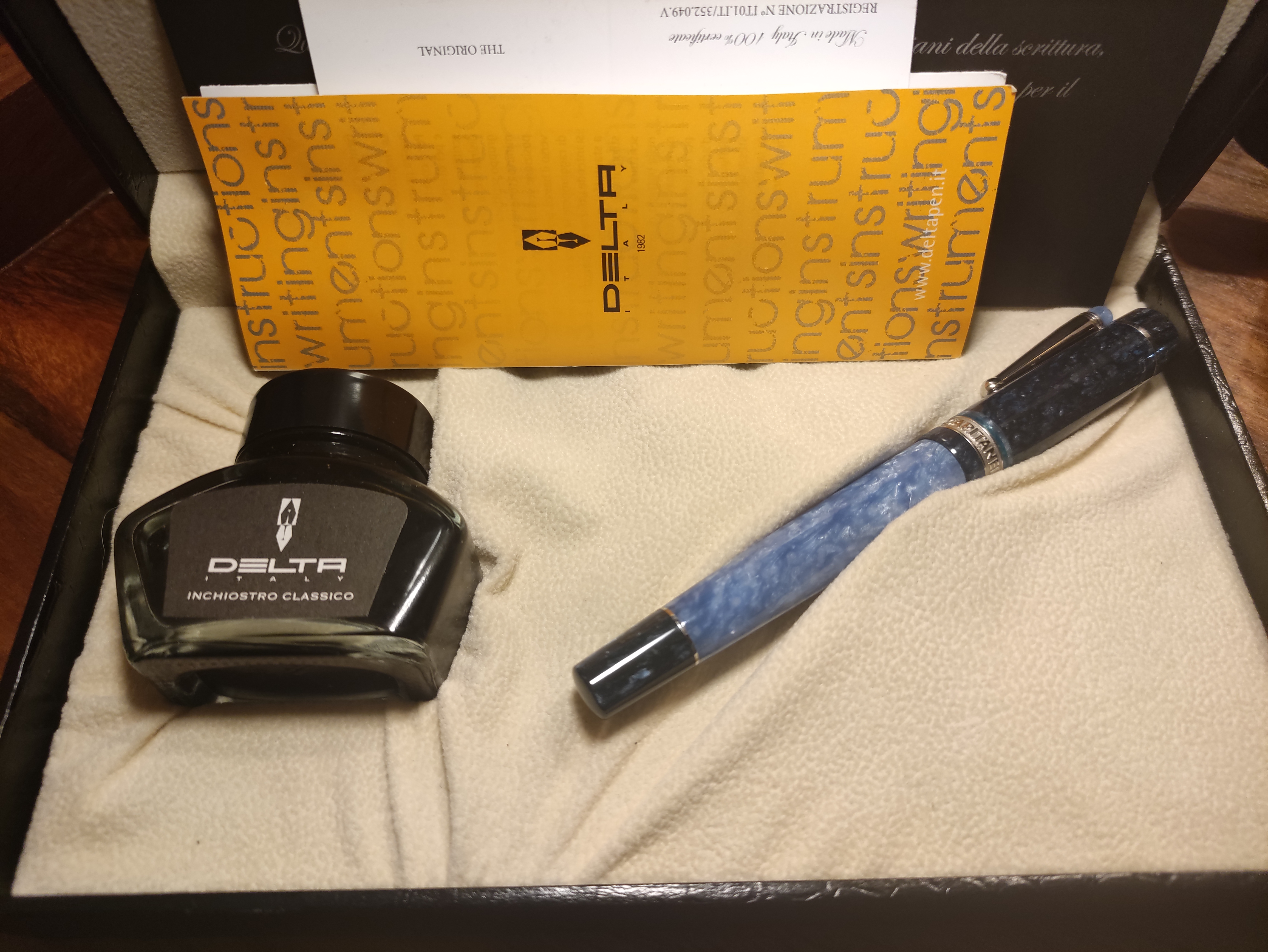 Come si può vedere la onfezione comprende un calamaio Delta, con inchiostro nero