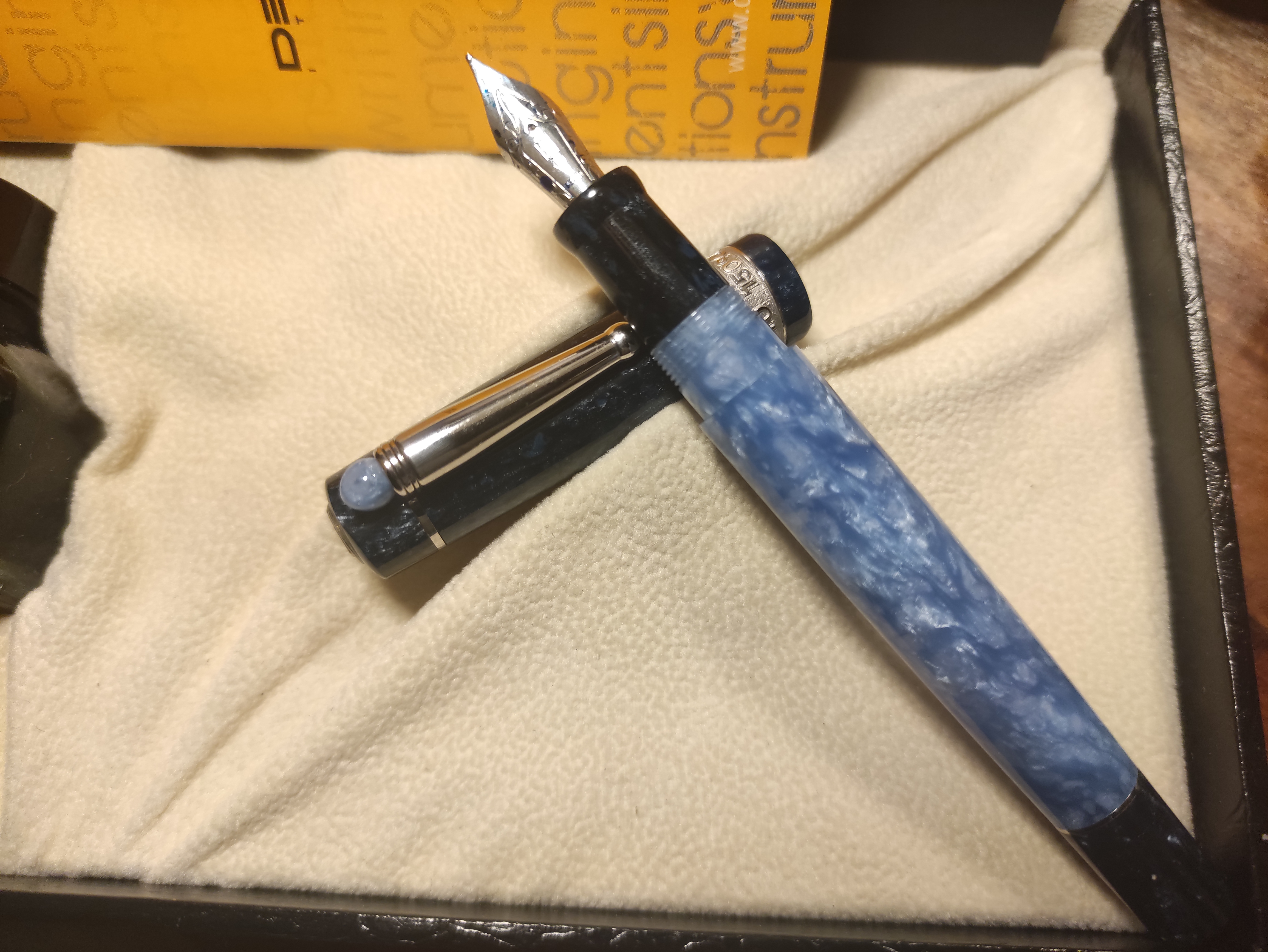 La scatola Pineider è davvero particolare. Mi piace che la abbiano corredata di calamaio da viaggio...chissà se non mi capiti l'occasione di usarlo.