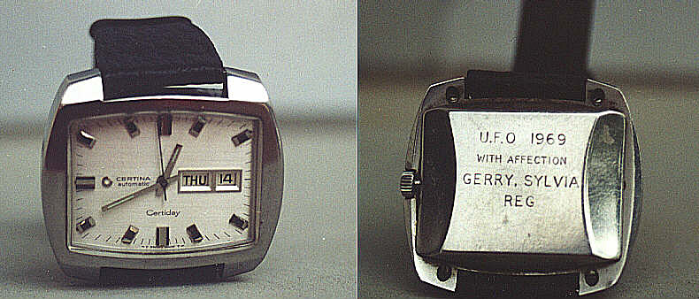Infine il regalo orologiero: E' un Certina Certiday di forma, trovato in condizioni molto buone, fu prodotto a partire dal 1968 e ricalca i canoni estetici del periodo. La particolarità è che fu l'orologio indossato da Ed Bishop, il mitico comandante Straker della serie UFO, prodotta negli anni 70 da Gerry e Sylvia Anderson(stessi produttori di Spazio 1999). Per gli "stagionati", la serie rappresenta un mito della fantascienza anni 70. L'orologio di Bishop con dedica degli Anderson, pare che fosse stato sempre indossato dall'attore fino al giorno della sua prematura scomparsa