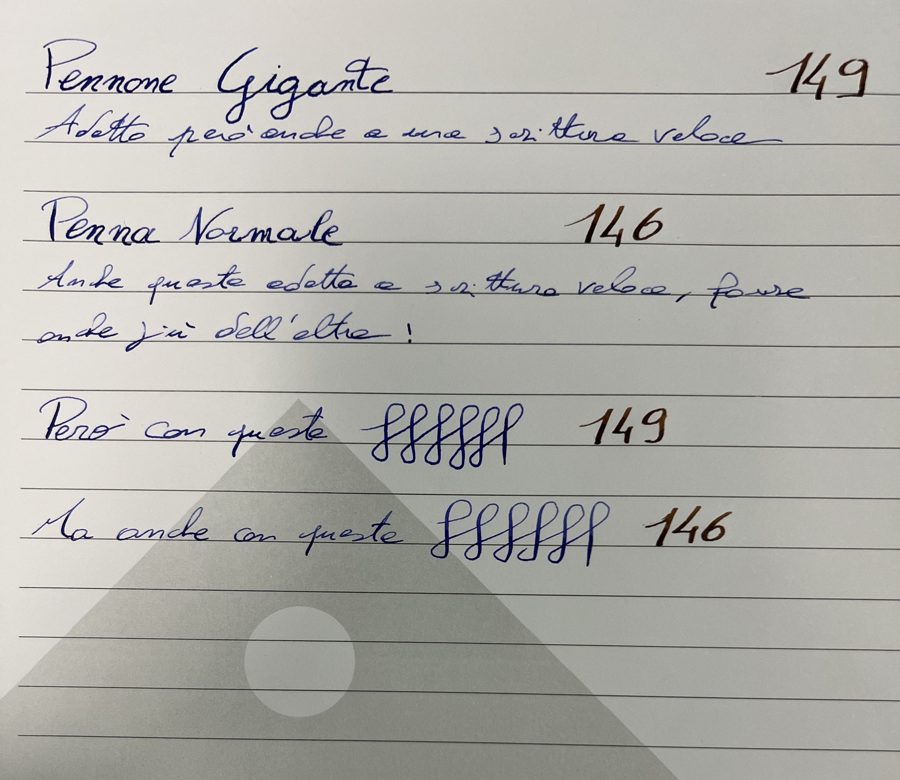 La 146 è perfetta per la scrittura di tutti i giorni. Secondo me può sostituire una classica 146 con pennino F, con l’opportunità di avere una variazione di tratto piacevole ma poco impegnativa. Tratto di partenza sicuramente extra fine. Più fine della 149 senza dubbio.